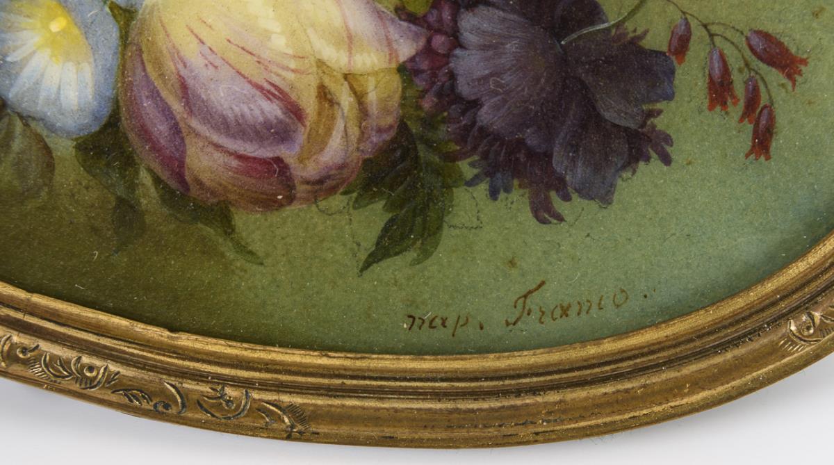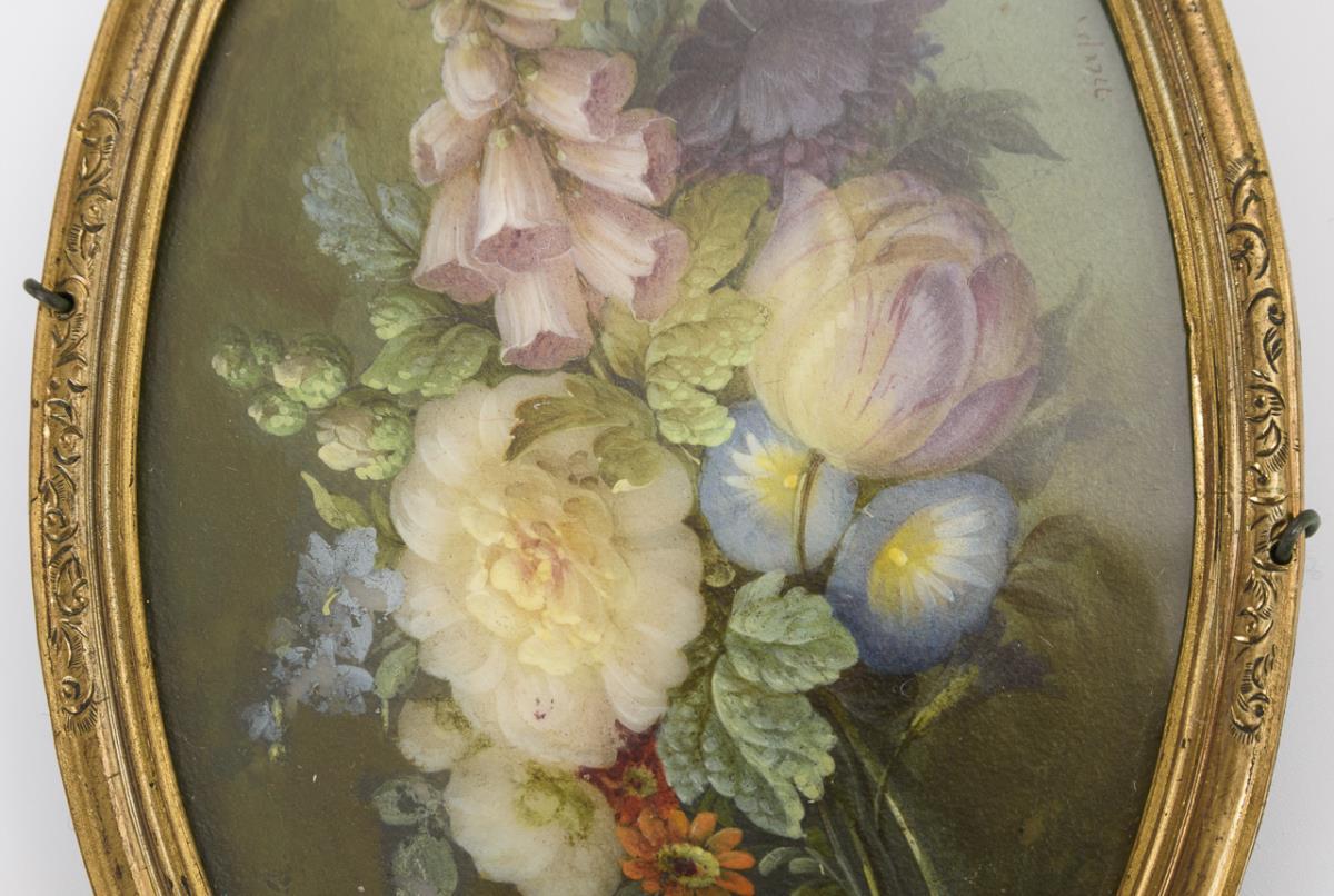 Detailed and quality painted floral pieces with various plants. Slight traces of age.