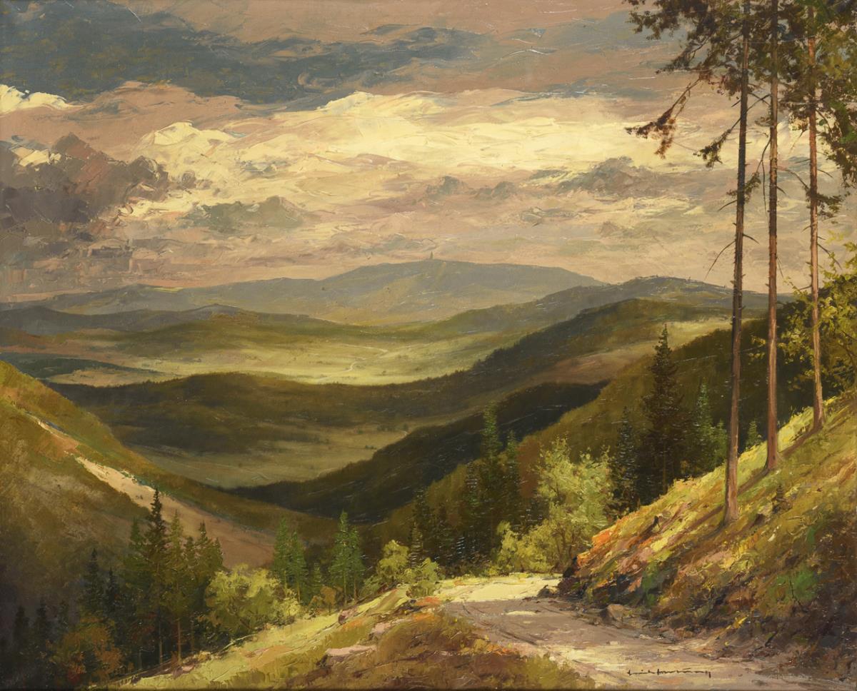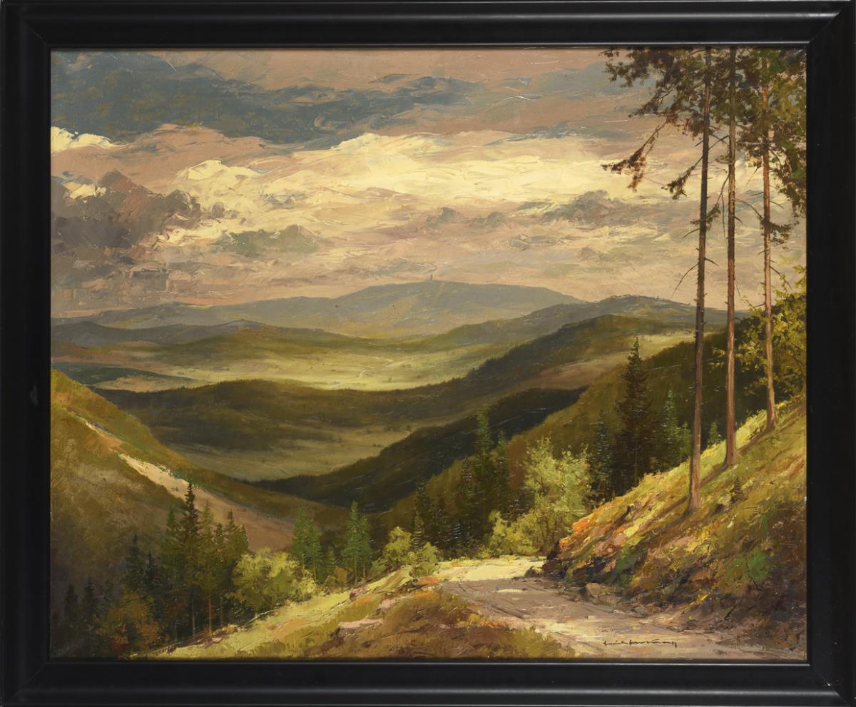 View over the Thuringian Forest to the mountain under cloudy sky.