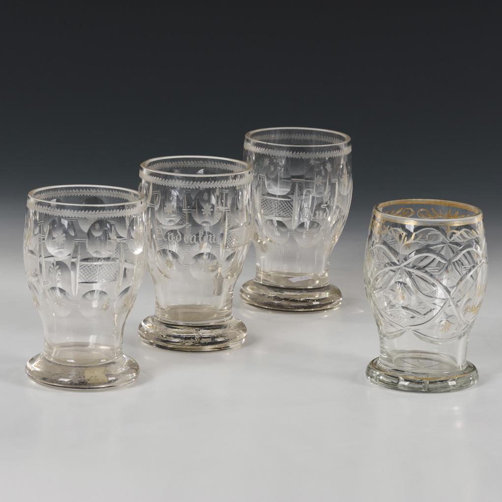 Mug with solid round base. 3x with lentil and notched decoration and engraved flowers and inscription "Andenken". 1x with notched decoration. Gold rubbed, 1x with 2 abraded rim chips, 1x with minimal rim chip.