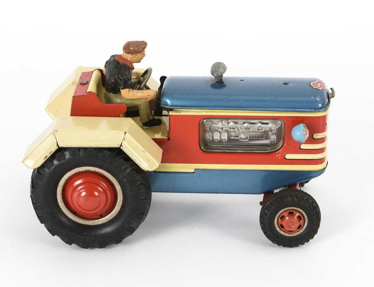 Tin tractor for battery operation, with mass figure as driver. Slight signs of age, function not tested.