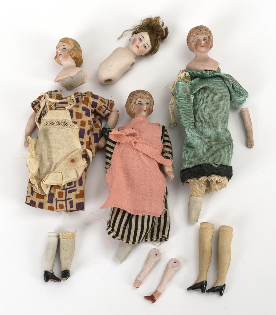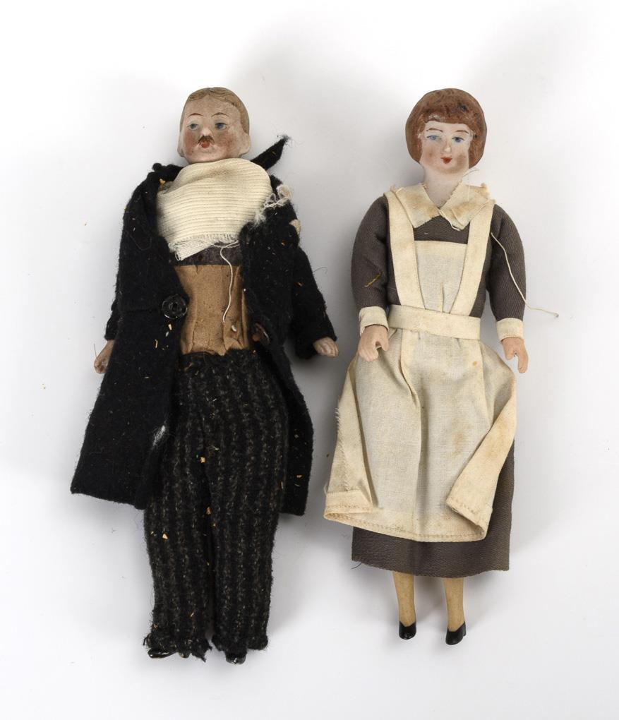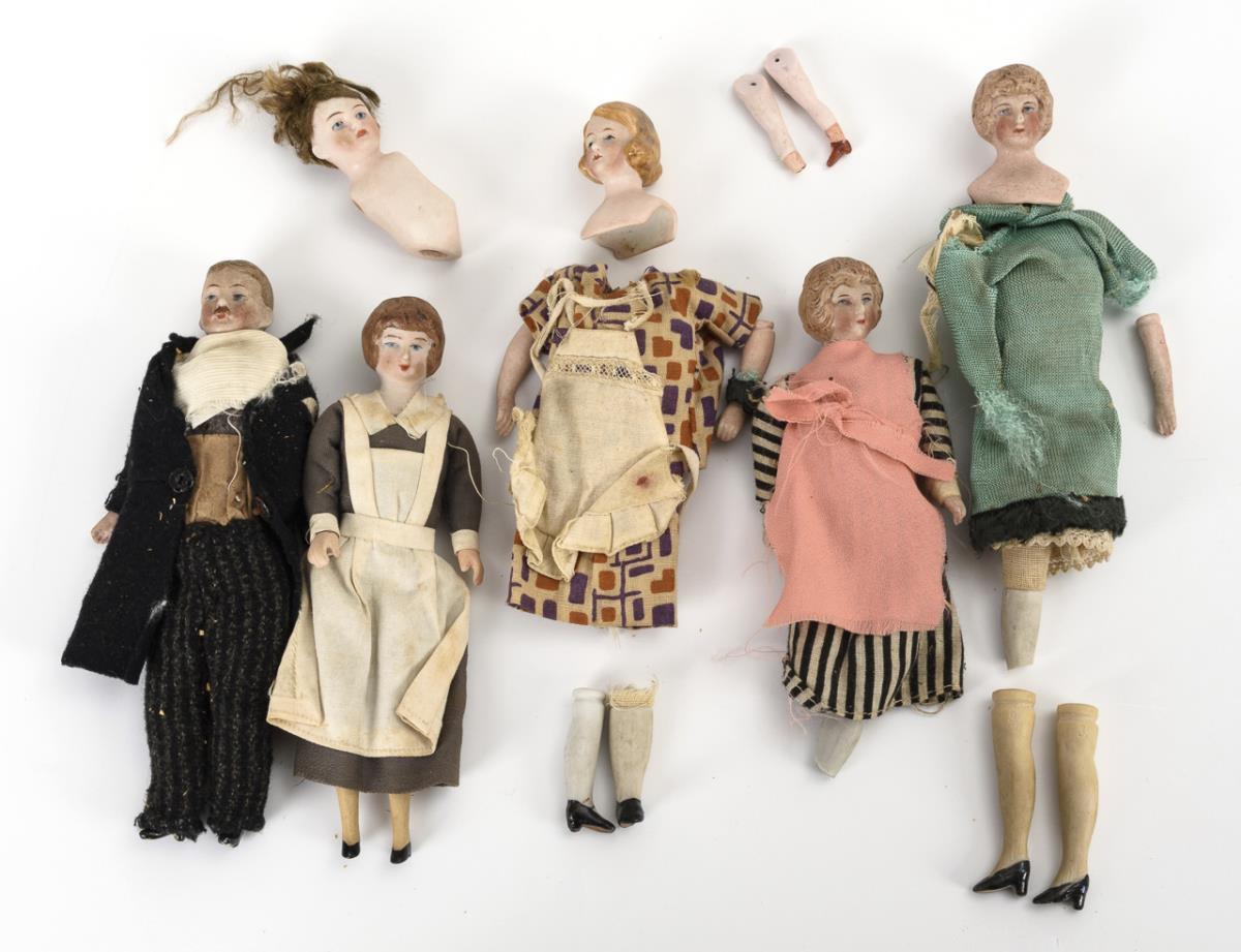6 dolls for the dollhouse: Gentleman with mustache and black felt coat, nurse with white apron and 4 defective and disassembled dolls. Missing and defective parts.