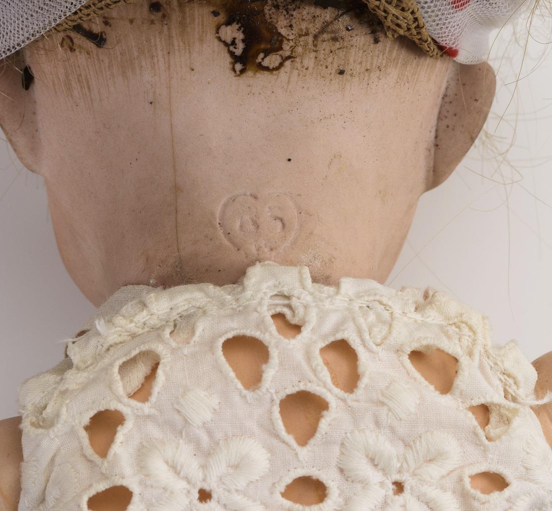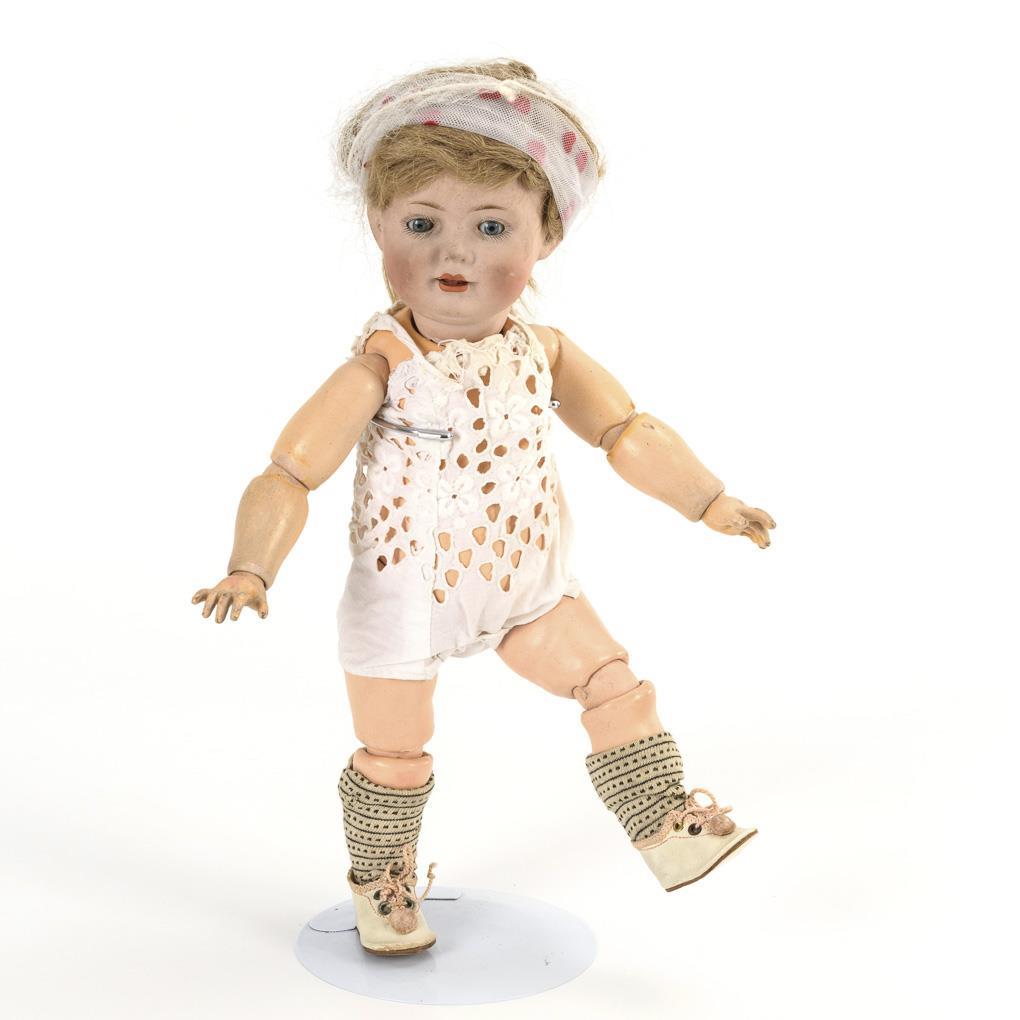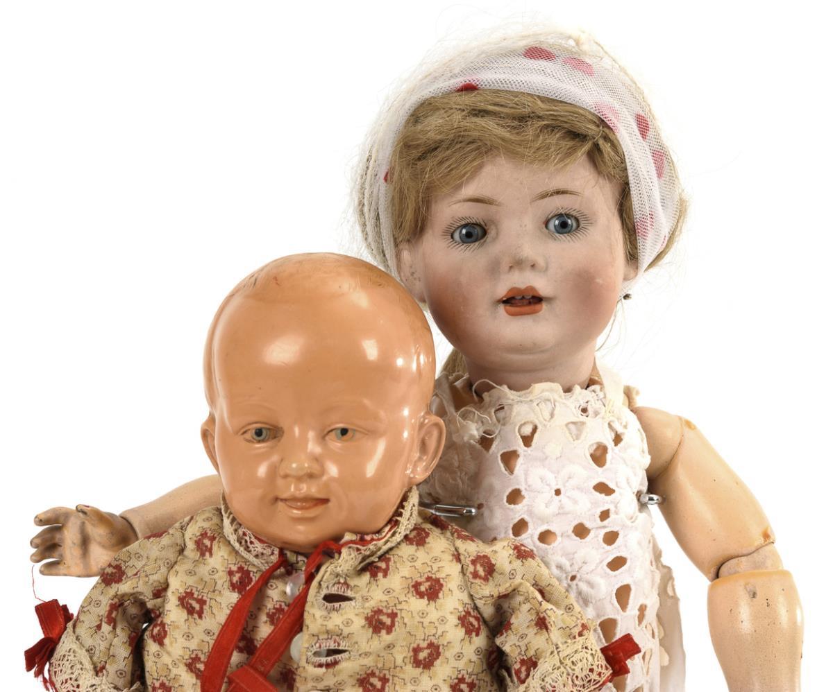 Full-headed doll (marked: BSW in heart /2094) with blue sleeping eyes, defective blond human hair wig and 15-piece toddler body. Schildkröt doll (marked: Germany SiR (old) protection mark) with chest head and cloth body and defective celluloid hands. Porcelain head with hairline crack at the back of the head and small breakout at the neck crank. Chest head with rubbed eye painting.