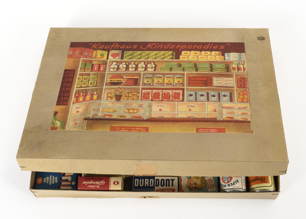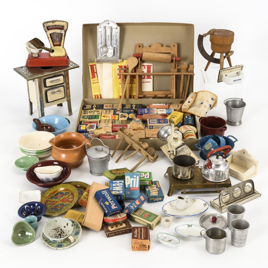 Extensive convolute with stove, scales, coffee grinder, several wall shelves, bowls, jugs, buckets, etc.. In addition, numerous cardboard boxes. Played, partly with signs of age.