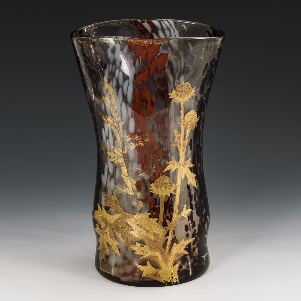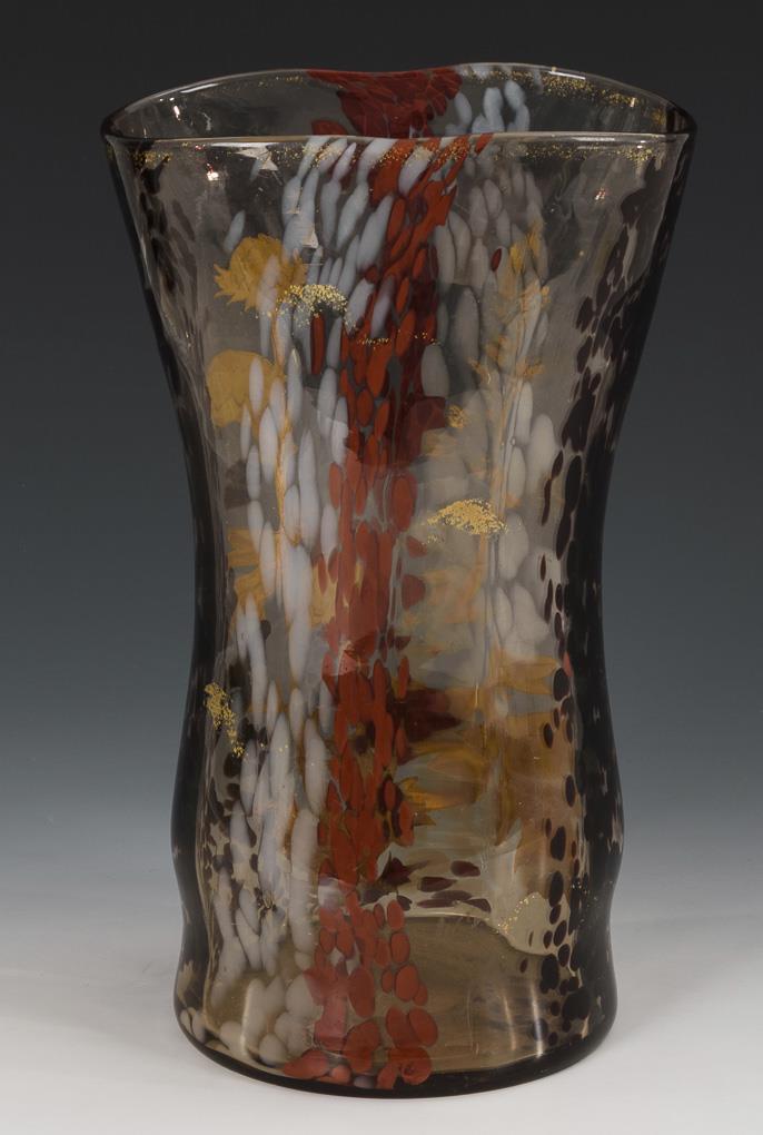 Colourless, slightly brownish glass with opal white, red and burgundy powder fusions, relief gold painting. H 29 cm.