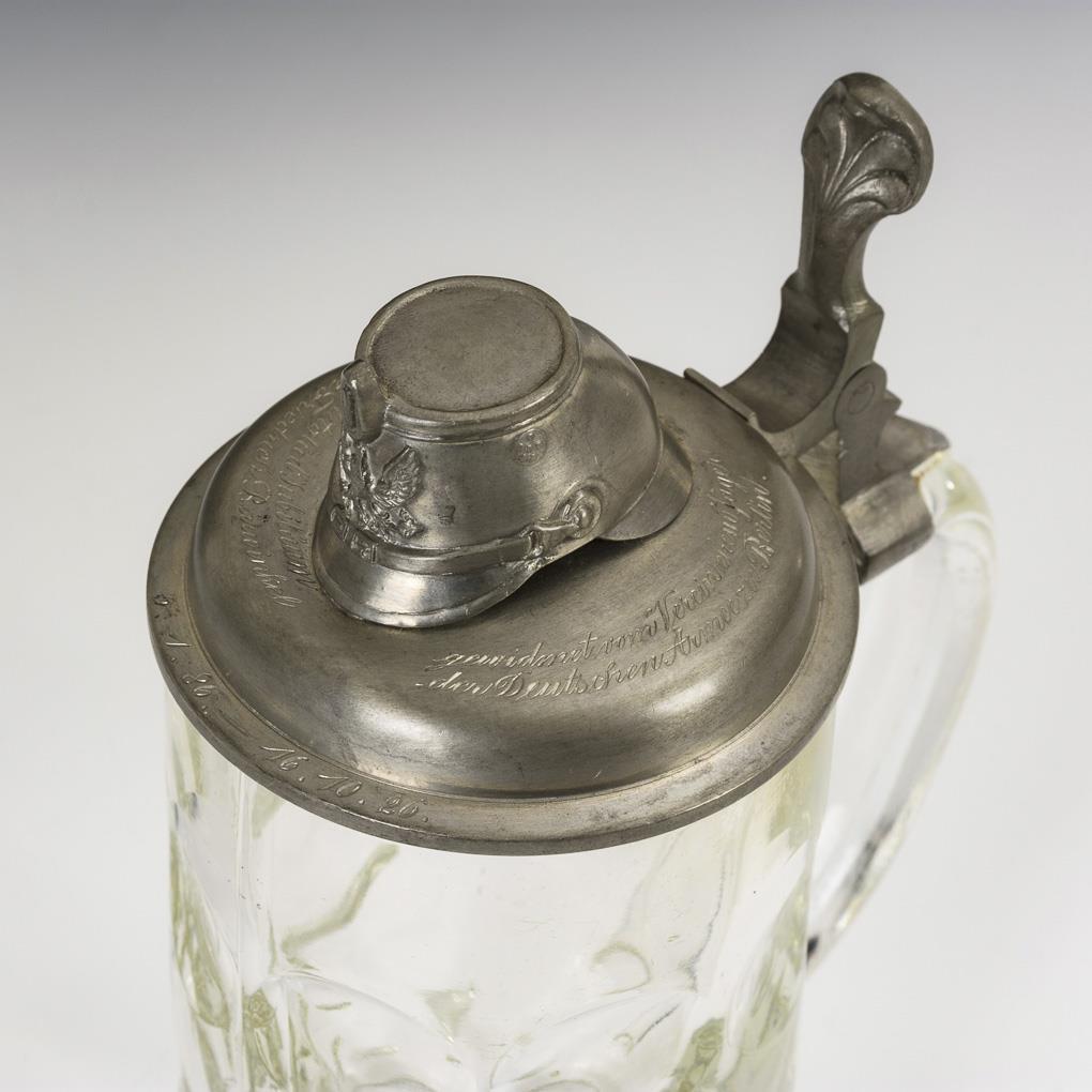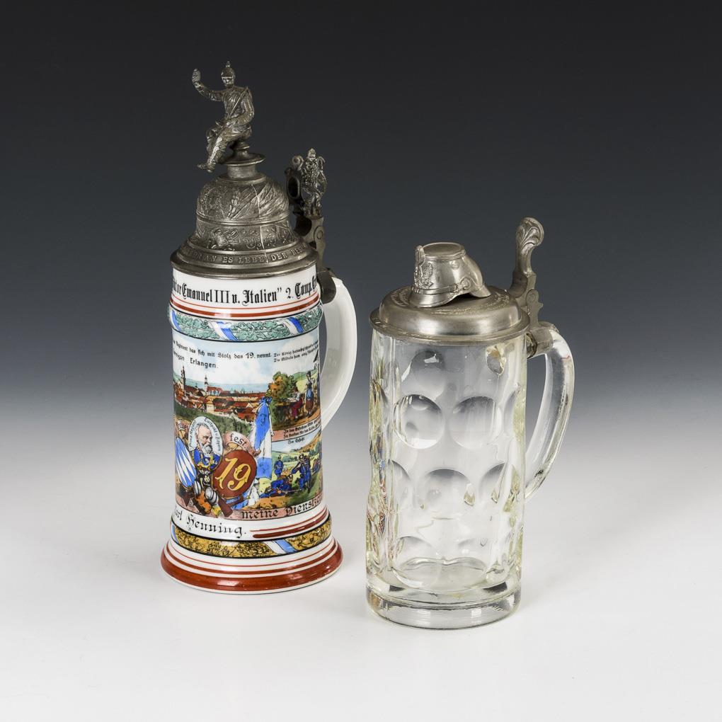 Porcelain jug with Erlangen view and portrait of Prince-Regent Luitpold v. Bavaria. "Karl Henning 19th Inft. regiment, 'King Viktor Emanuel III v. Italy' 2nd comp. erlangen 1907/09". Pewter lid with lion back and infantryman as crowning. / Glass jug with lenses, pewter lid with Tschako as well as dedication engraving to the 40-year membership in the Association of former hunters of the German Army to Berlin 1926.