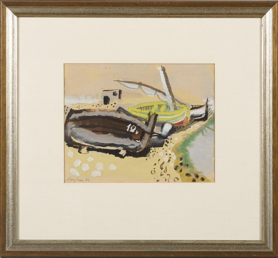 The boats in the bright light on the beach. Slight creases at the edges.