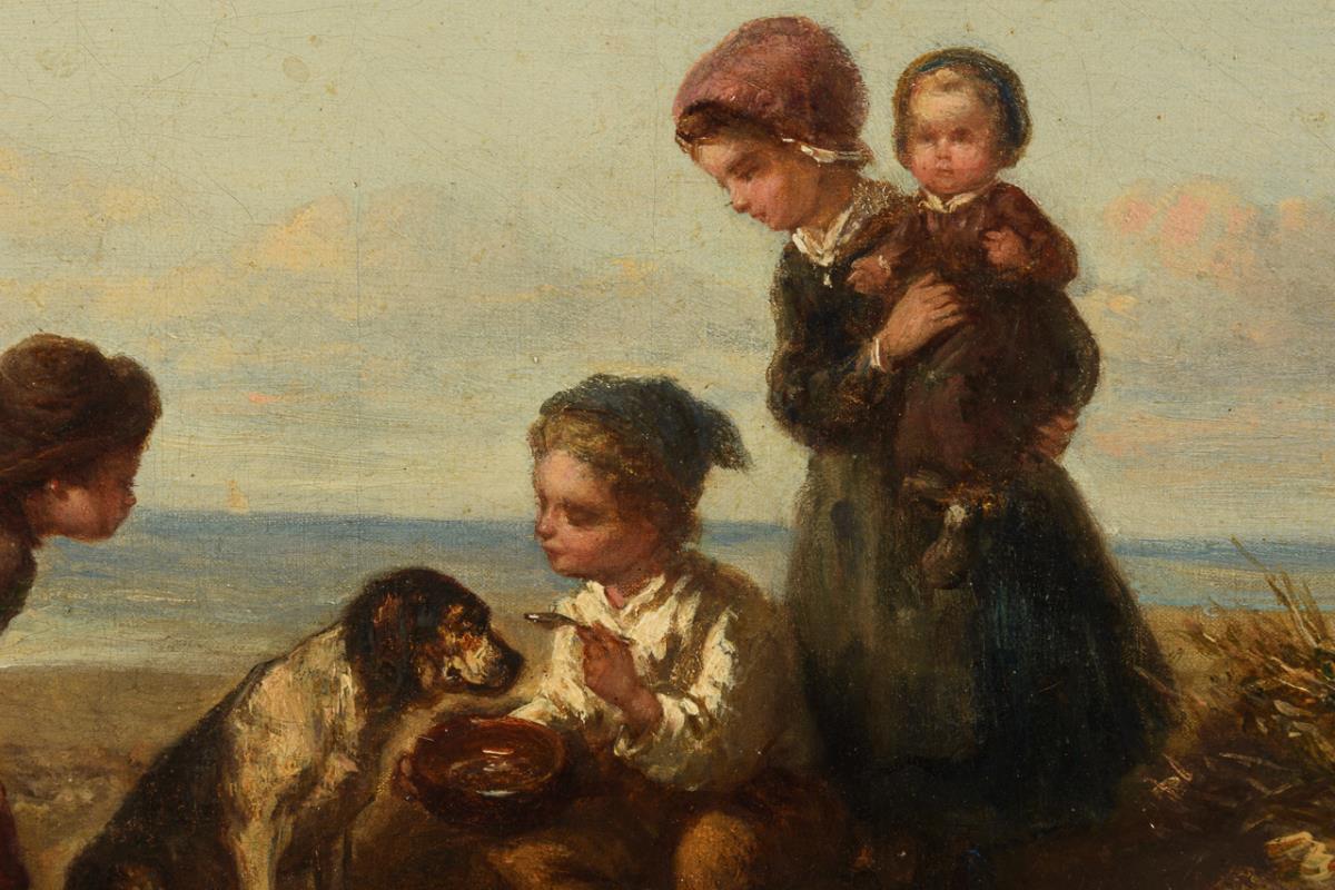 The children feeding a dog in the sunshine on the beach near the boats. Canvas doubled.