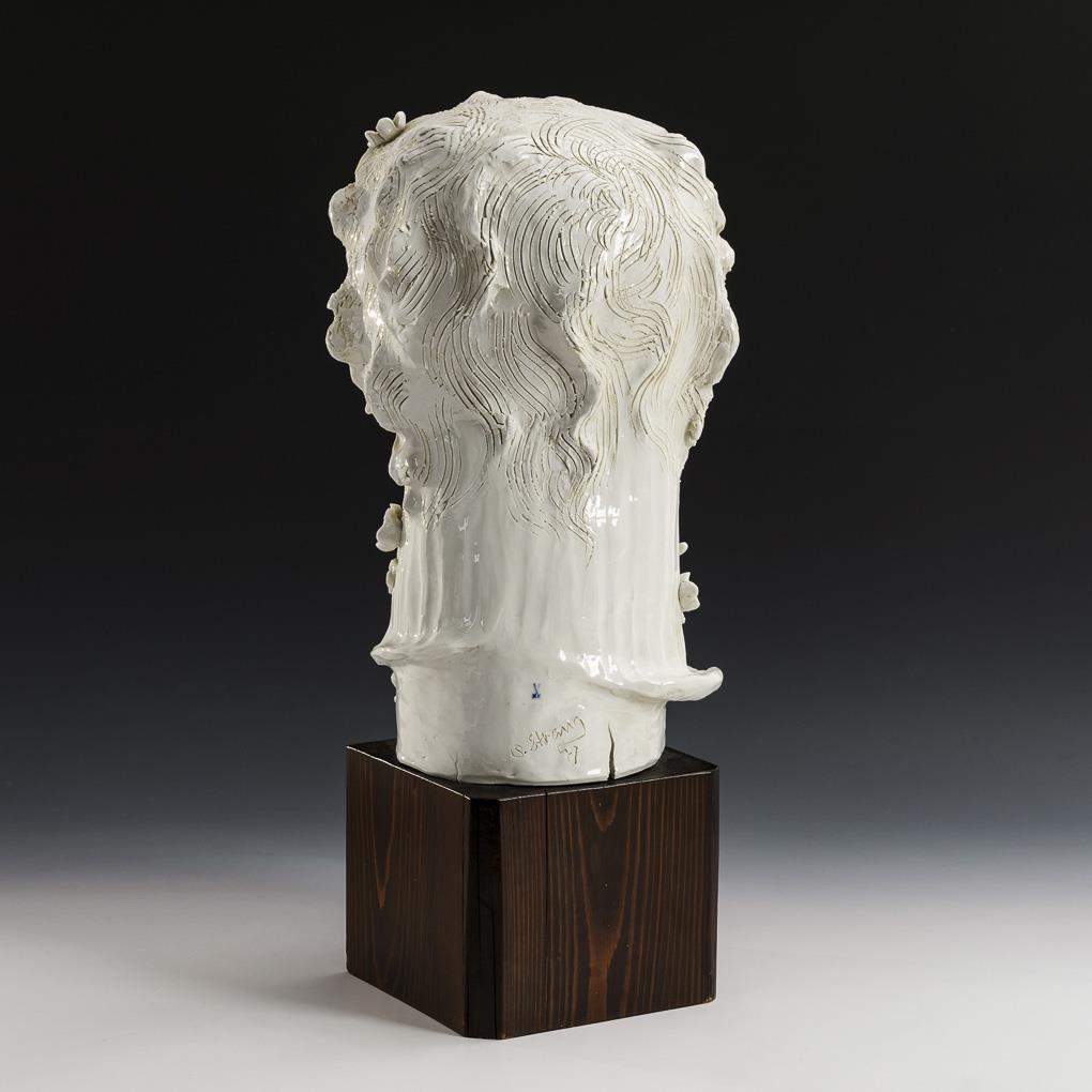 Modern sculpture of a large female head with long hair and flower branch. Schauseitig a fire crack, which was included in the base design, in that the crack is taken up by the wooden base and continued.