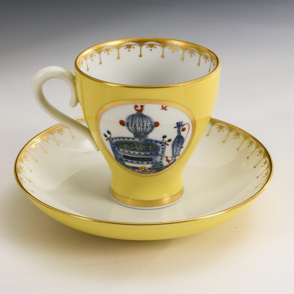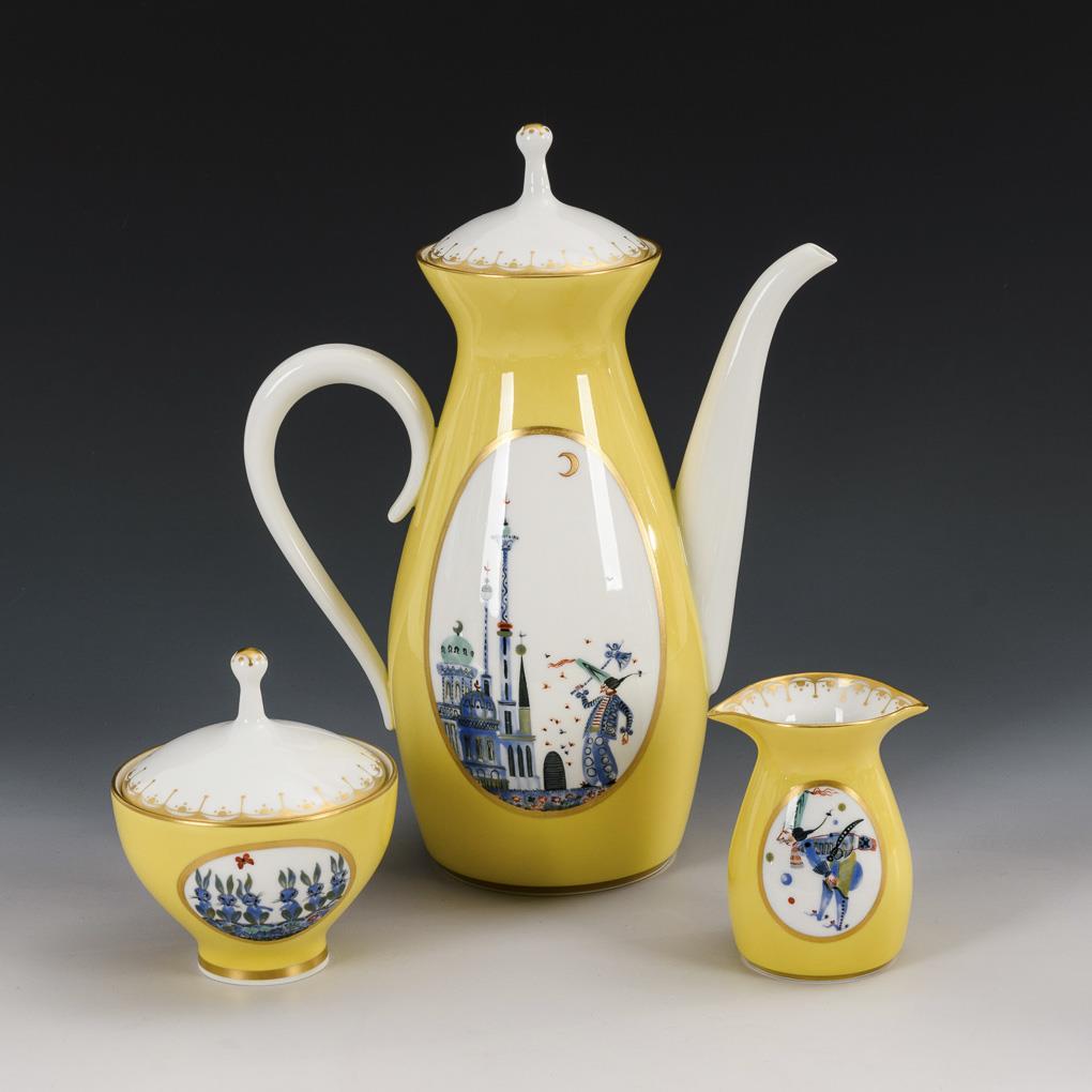 21 pieces. So-called "collective service". Model by Erhard Grosser, Alexander Struck and Ludwig Zepner. Decor by Heinz Werner and Rudi Stolle 1961. In gold-framed cartouches depictions of the famous adventures of Baron von Münchhausen. Coffee pot (h 27.5 cm), milk jug;er, sugar bowl, 6 coffee cups, 6 saucers and 6 cake plates. Hairline crack on the edge of the milk jug.