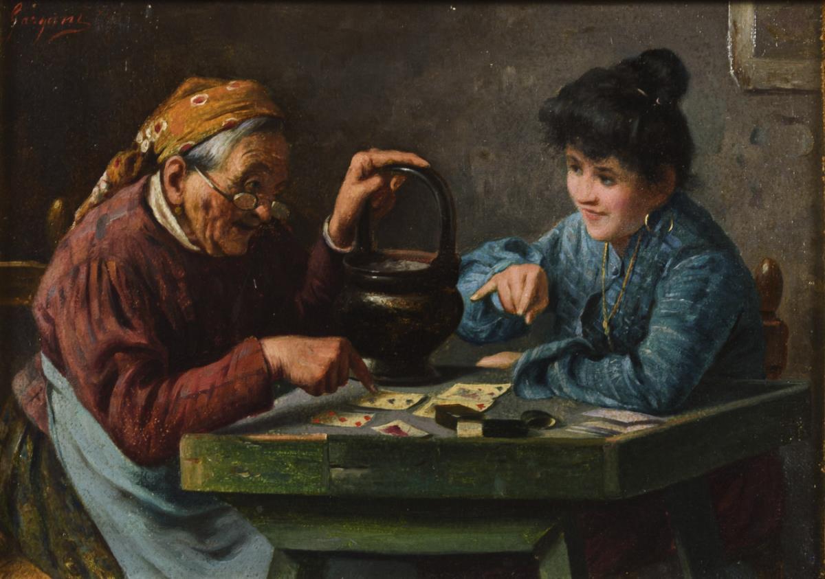 Old peasant woman at a table with the young fortune teller and the cards laid. canvas doubled.