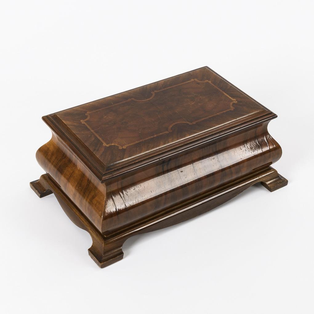 Walnut and maple veneered and solid. 12.5 x 31.5 x 20 cm.