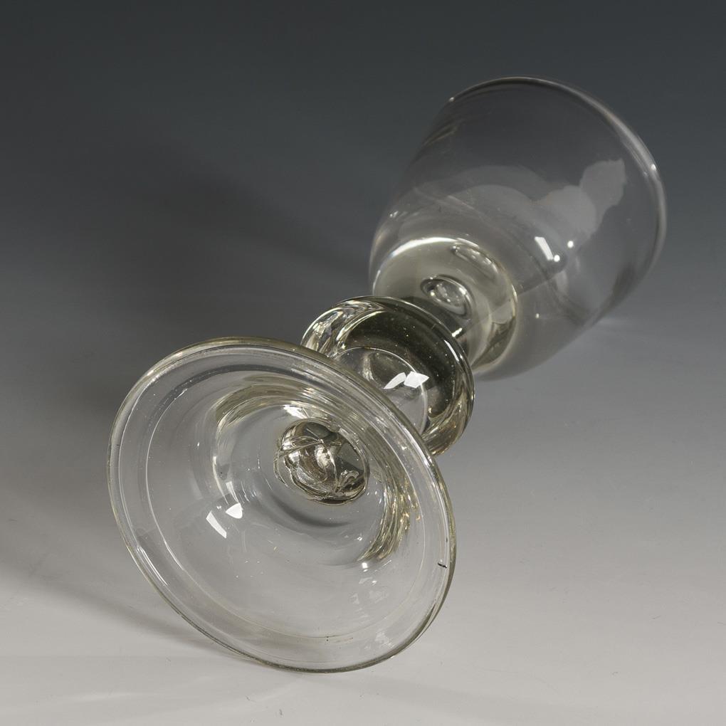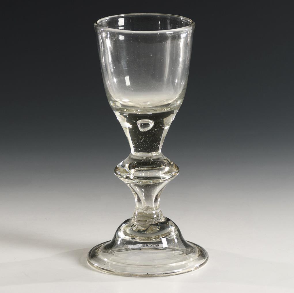 Conical cup with pierced bubble at the base of the cup, baluster stem with pierced bubble, hat-shaped foot with everted rim, demolition.