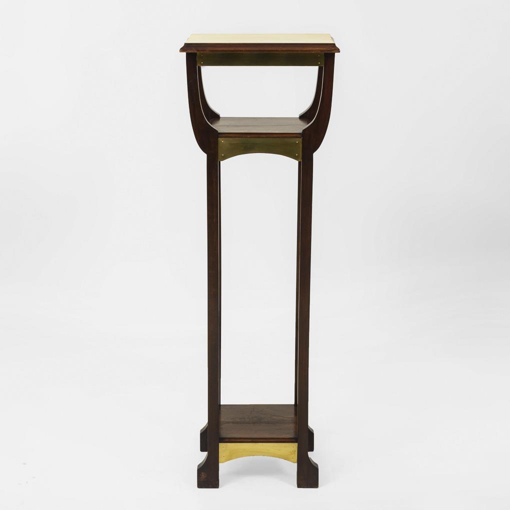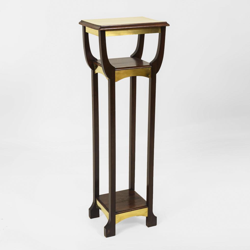 Pedestal in simple geometric form, on 4 partly curved pillar legs, with square footboard and shelf, rectangular top plate and frames decorated with brass sheets. Restored ready for living.