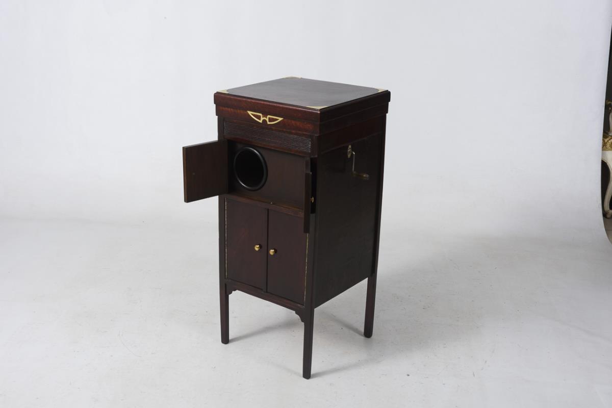 Square, plain 4-door cabinet on 4 pillar legs with integrated gramophone under hinged hinged lid, 2 doors for sound opening with integrated hopper, below 2-door record compartment with collection of 10 "Odeon" shellac records in original folder; tone arm with marked sound box "Homocord", spare needles, turntable, speed controller and brake, side crank. Case restored ready for living.