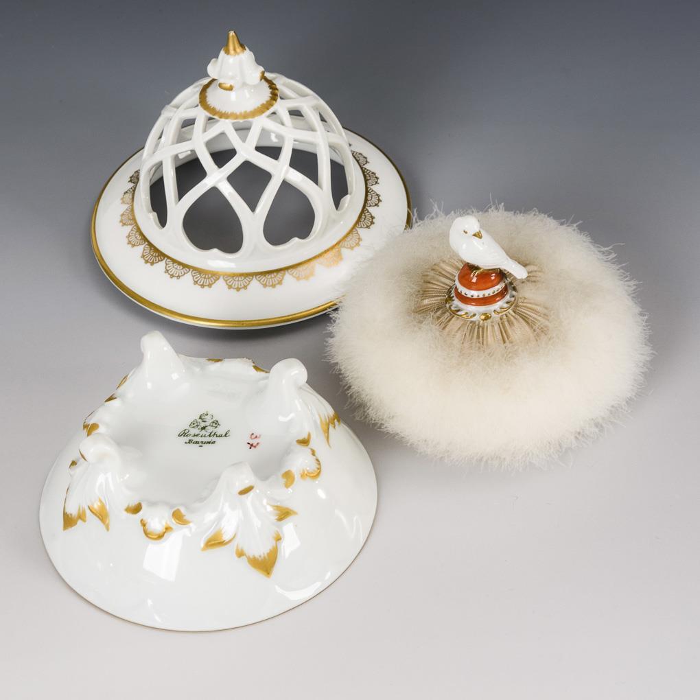 Conical body with four volute feet, lid with openwork dome and in the box a powder puff of ostrich feathers with bird knob.