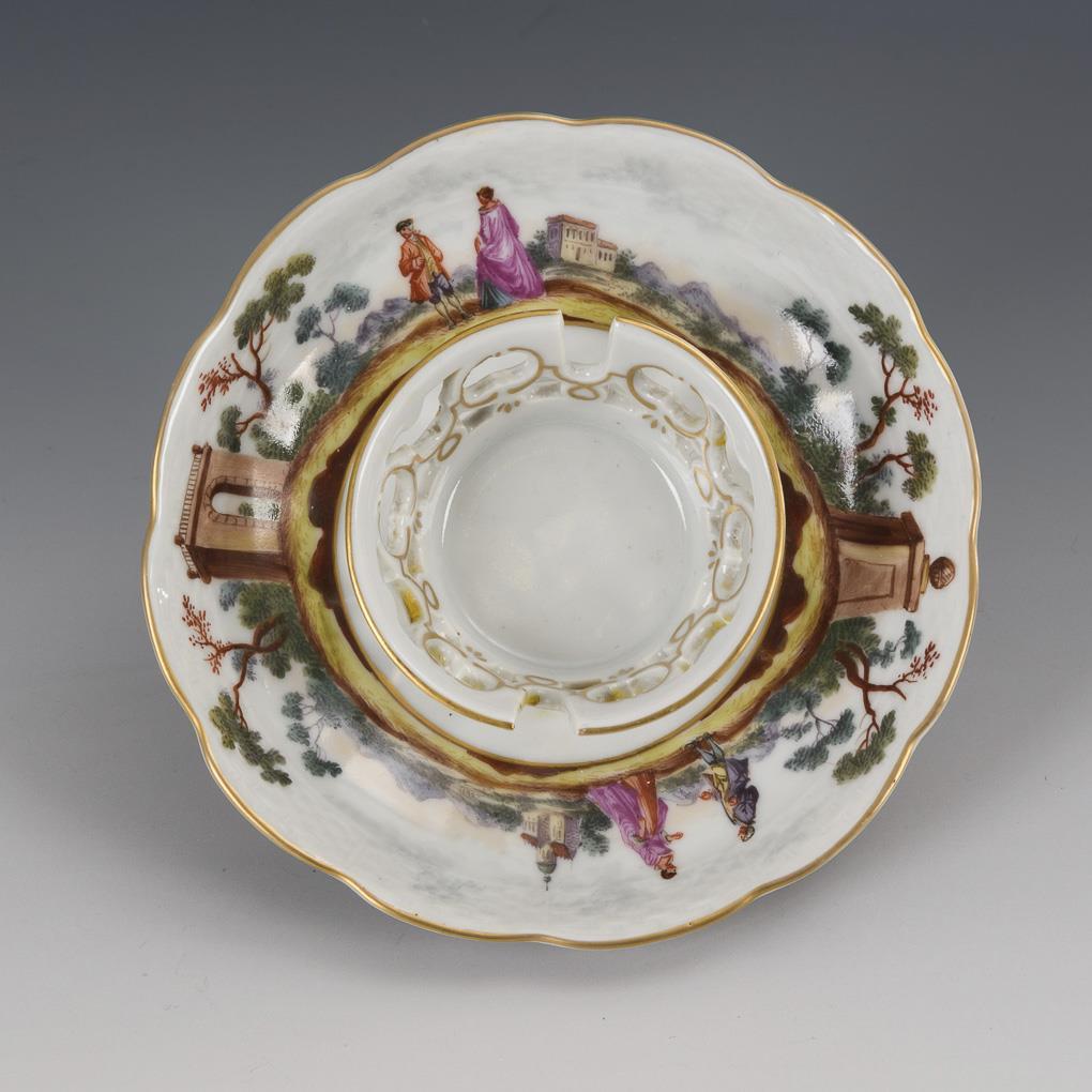 Saucer with corbel-relief rim and raised, openwork stand ring. On the flag landscape painting with architecture and people staffage.