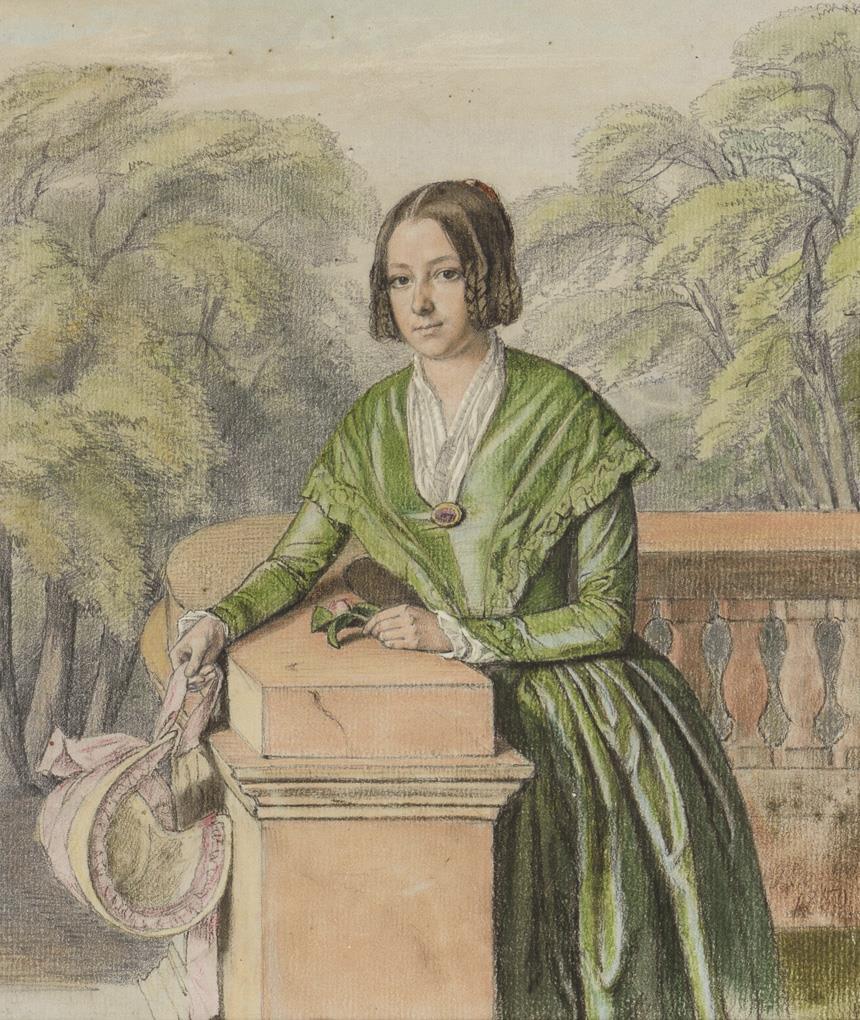 Young woman with hat and in green dress on a terrace in front of the trees. Little foxing.