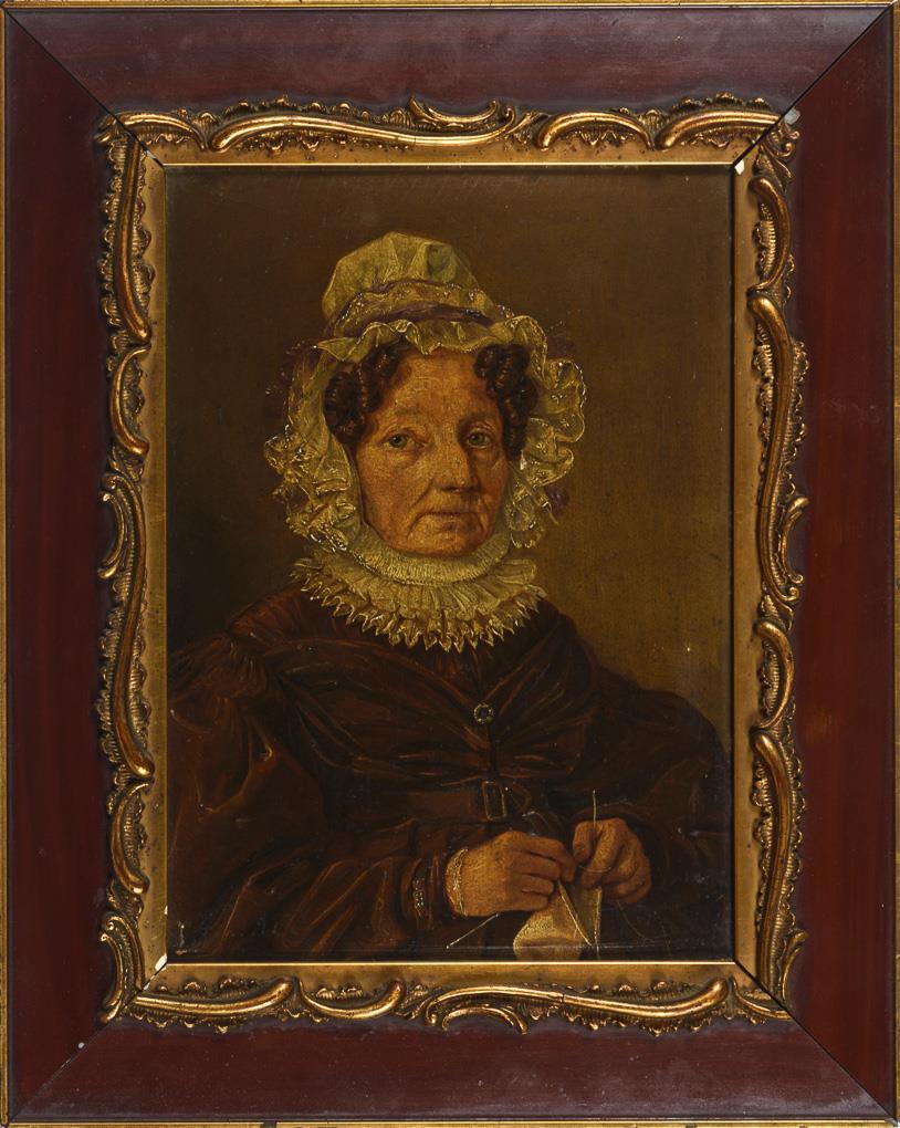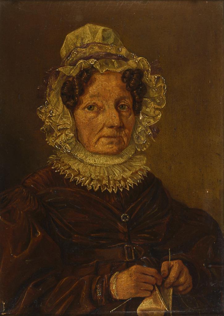 Portrait of an elderly lady in brown dress with lace collar at needlework. In need of cleaning.
