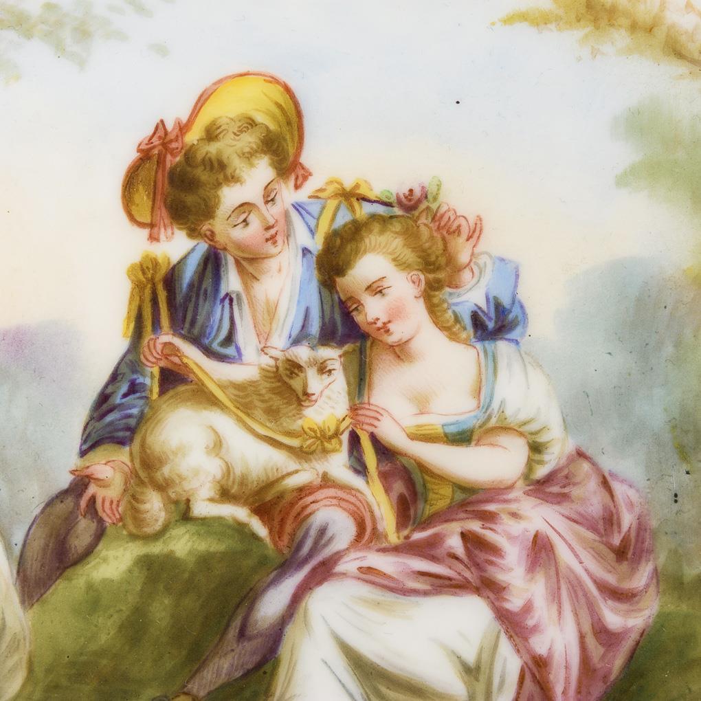 Rectangular bowl with yellow background. In the mirror depicting a gallant scene, on the flag bouquets of flowers in small cartouches.