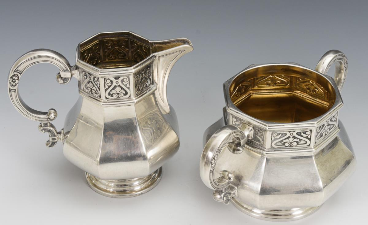 Faceted form with surrounding relief frieze: coffee pot, tea pot, milk jug and sugar bowl. Minimal signs of use.