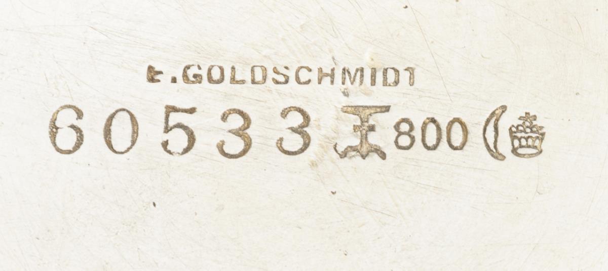 Company mark/800/crescent/crown hallmarked, with jeweler's stamp E. Goldschmidt. Early 20th c. Model numbers 60531- 60534.