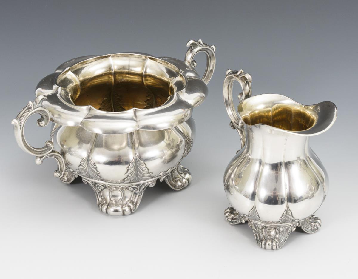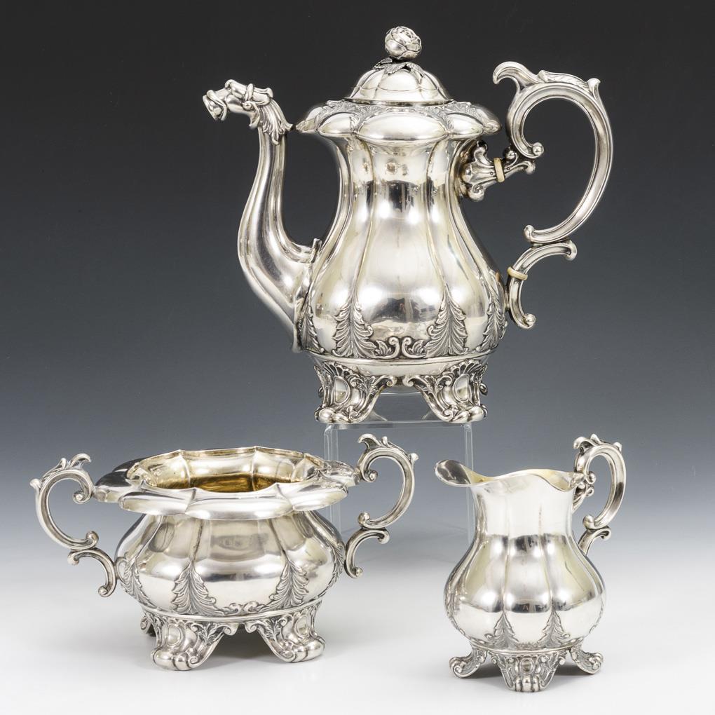 Coffee pot with animal head finial and rose finial, matching milk jug and sugar bowl.