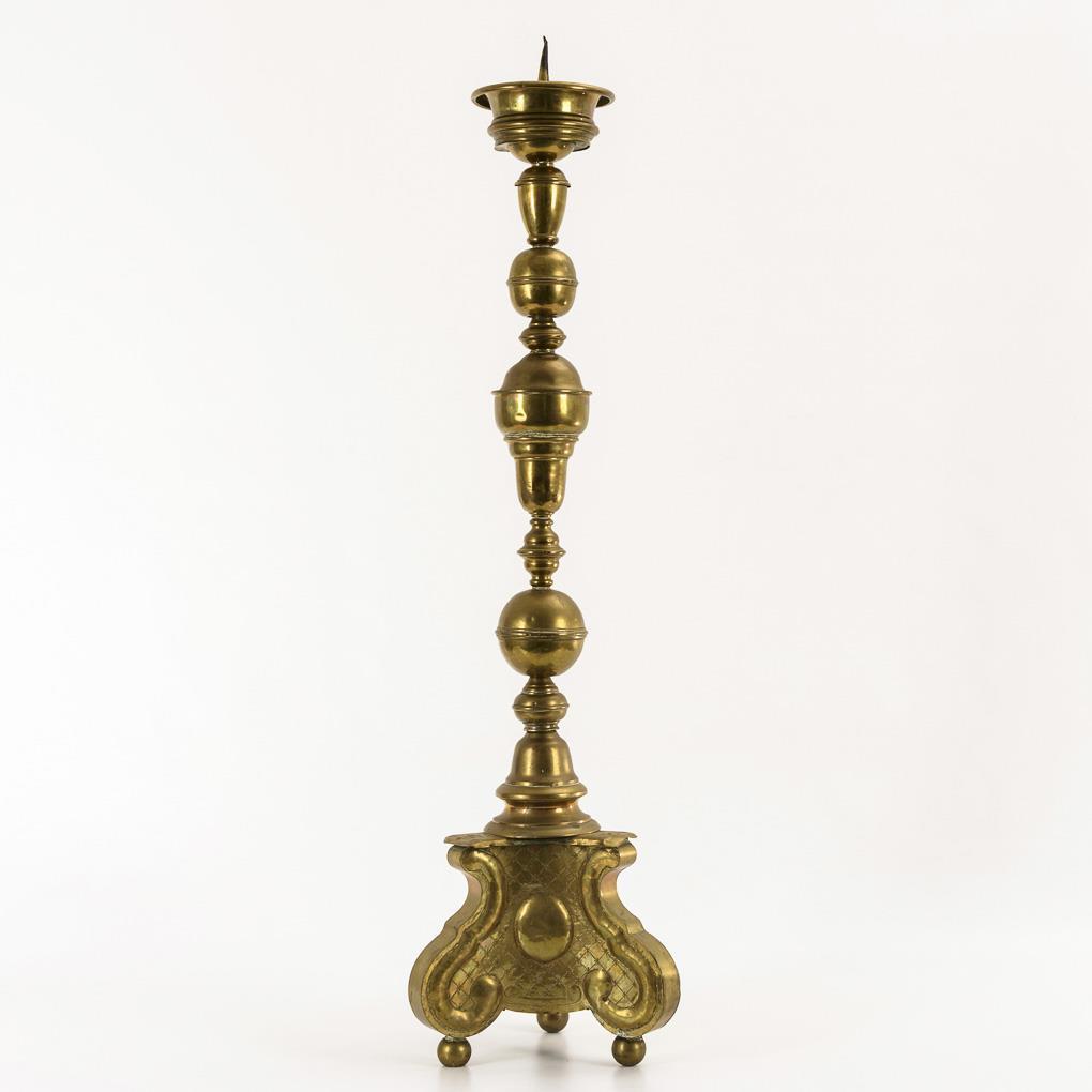 Candlestick in baroque forms with 3-sided volute base and baluster shaft and spike made of sheet brass. Signs of age/use.