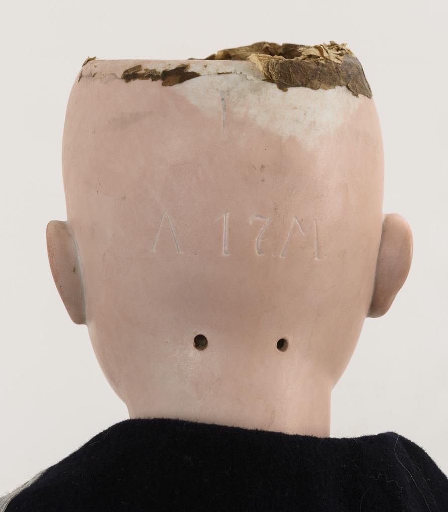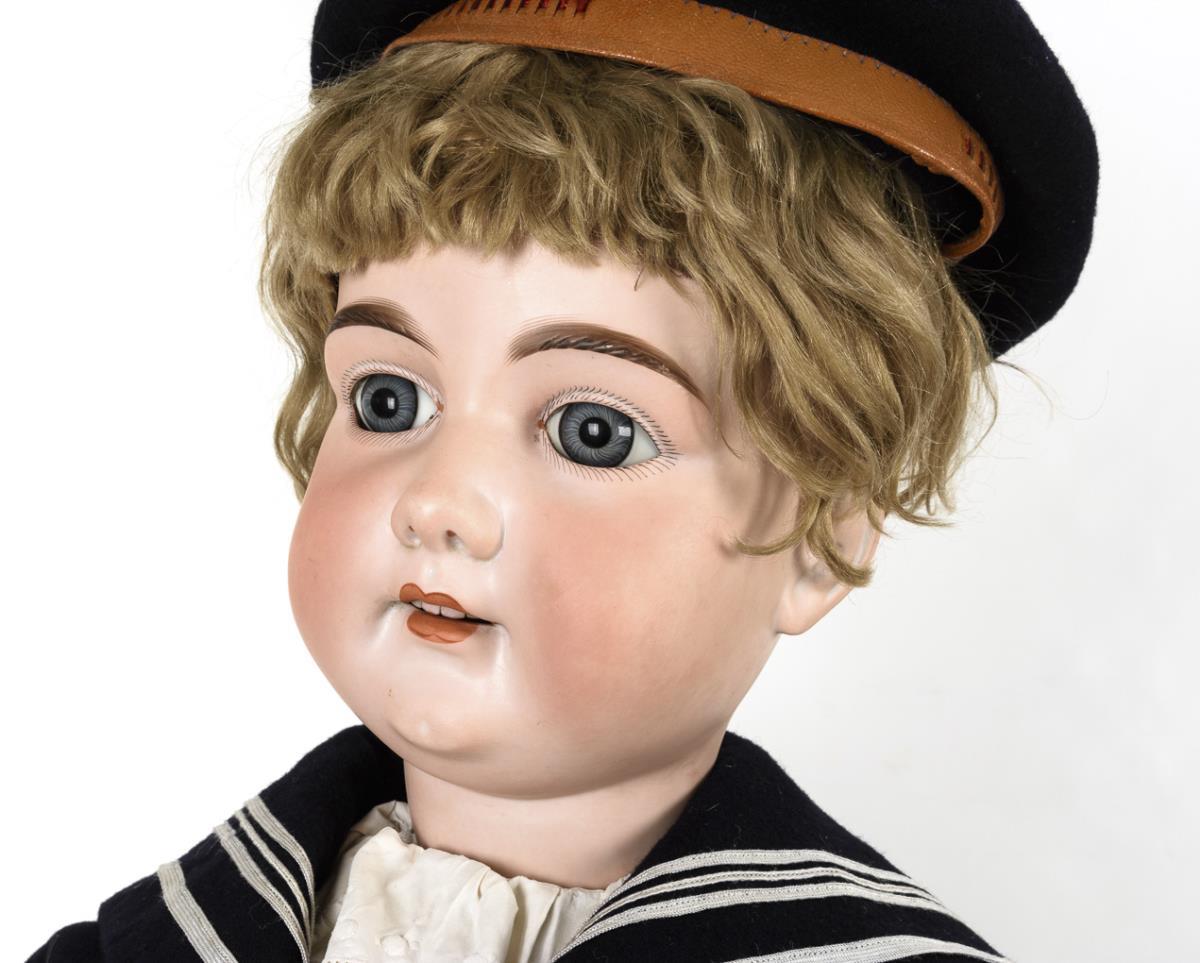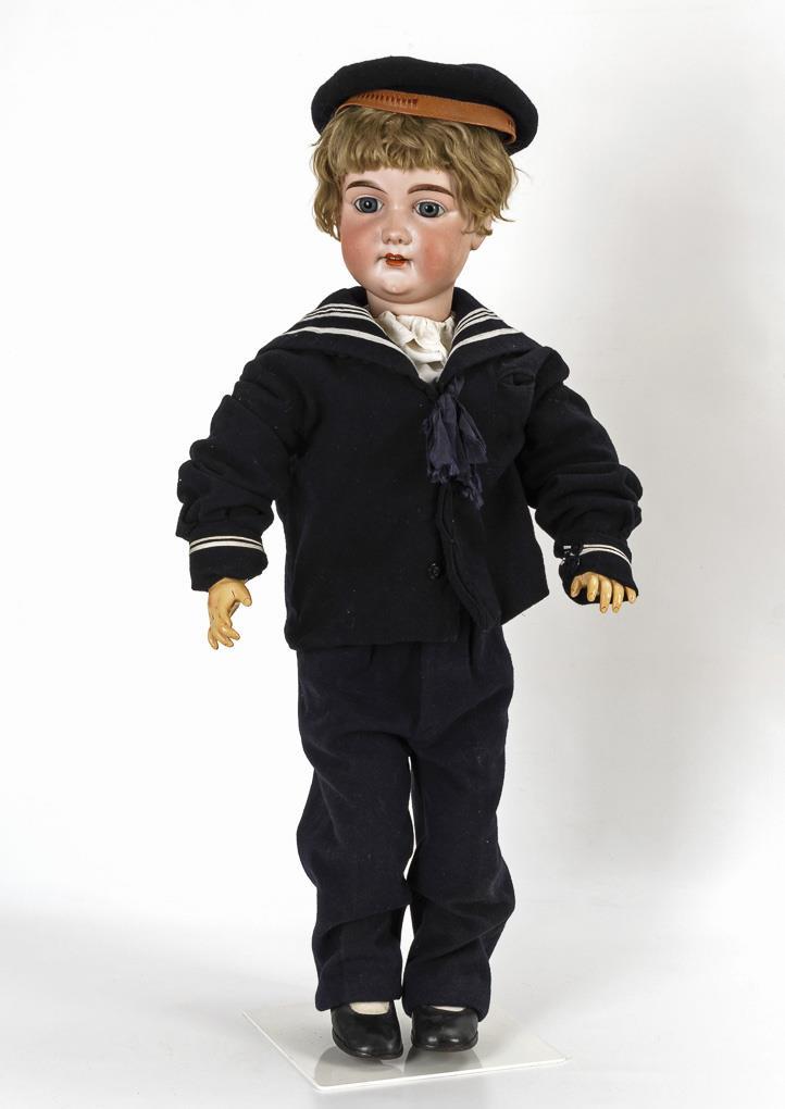 Crank head, fixed blue glass eyes, blond mohair wig. 17-piece jointed body. Dark blue sailor suit, black children's shoes. Head x-rayed: without defects.