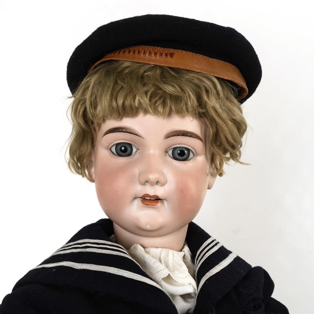 Crank head, fixed blue glass eyes, blond mohair wig. 17-piece jointed body. Dark blue sailor suit, black children's shoes. Head x-rayed: without defects.