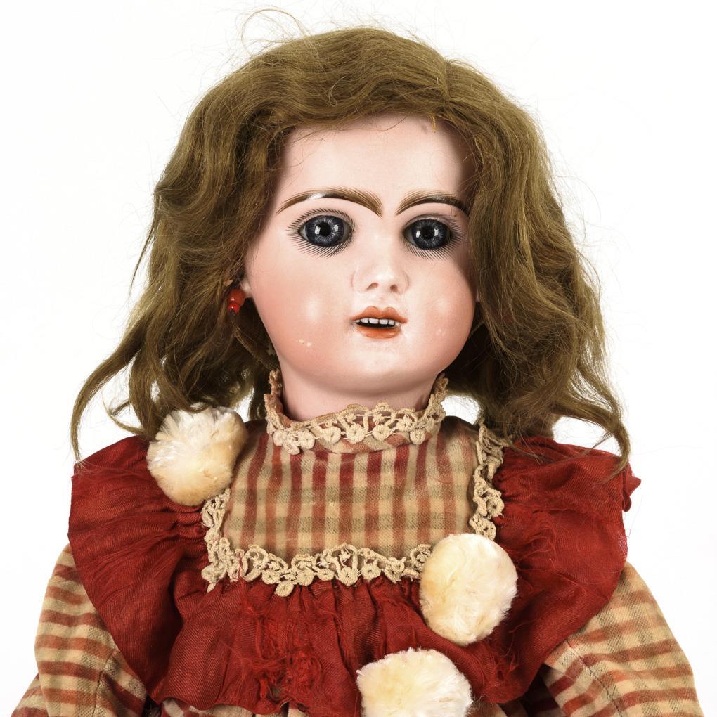 Crank head, fixed blue eyes, earrings, medium blond mohair wig. 11-piece articulated body. Old red plaid dress, black shoes. Small burn crack on the forehead and tiny chip on the left ear hole. Hands with paint defects.