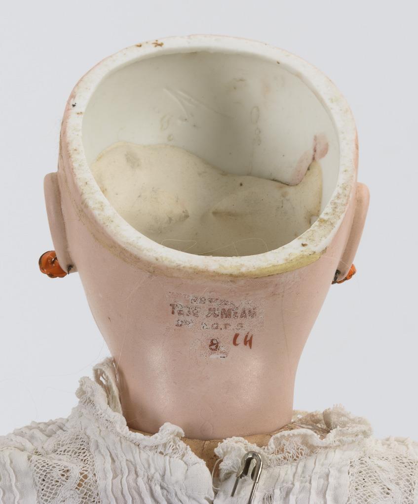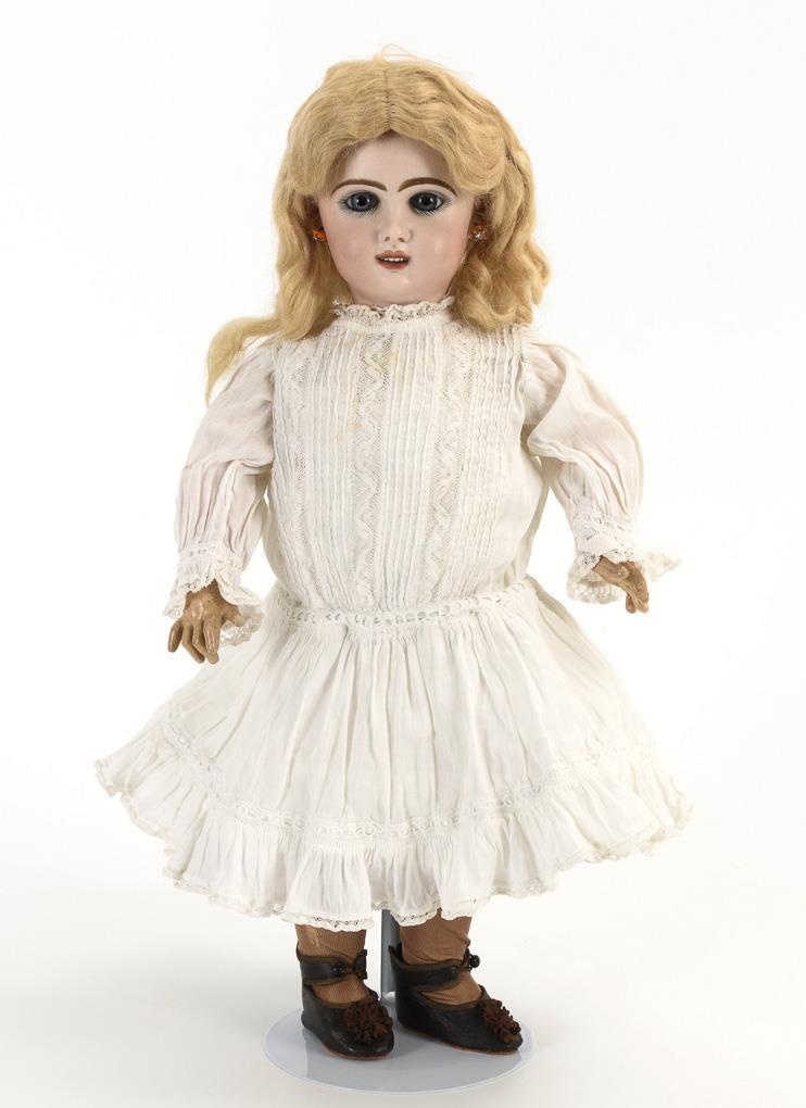 Crank head, fixed blue eyes, earrings, mohair wig. 11-piece articulated body with 2-piece torso and silenced train voice. White dress, original brown shoes. Hair tear at the back of the head, inside label of a doll clinic. 2 drawstrings on the body missing, right foot with glued break.