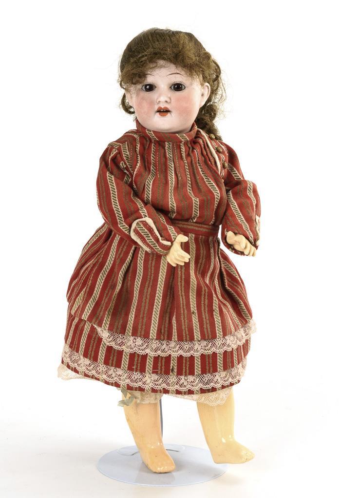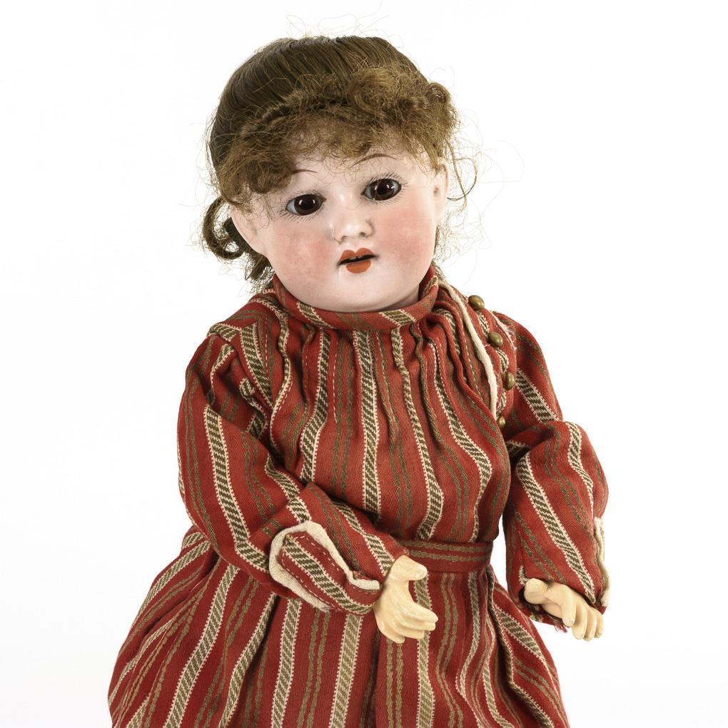Crank head, fixed brown eyes, light brown synthetic hair wig. 11-piece articulated body. Red and white striped dress. Head cover solid: not x-rayed, but without visible defects.