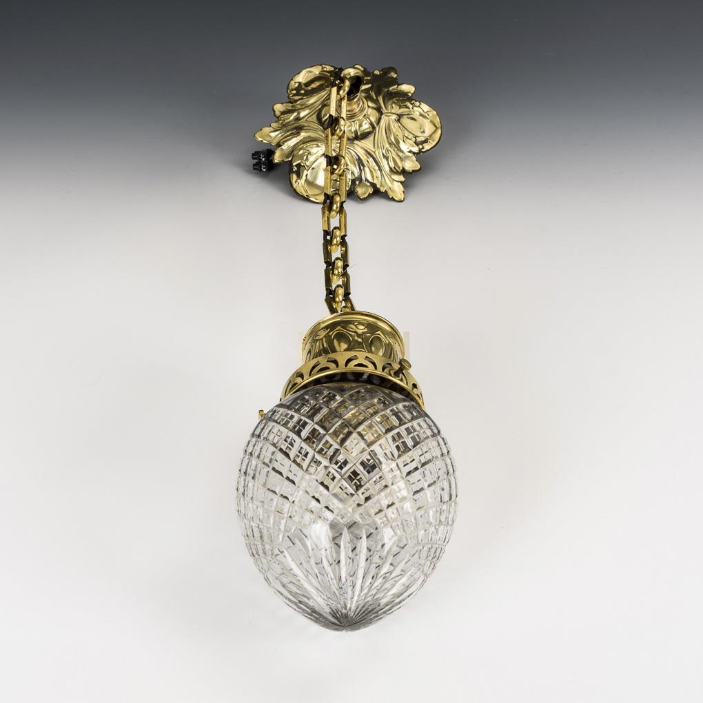 Stamped brass sheet, clear glass shade with geometric engraving, 1-light screw socket. H total 57 cm, Ø 11 cm.