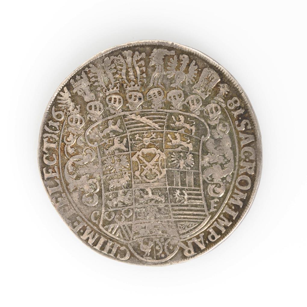 John George III 1680-1691, in armor with sword shouldered, helmet with plume open in front of him. "IOHAN GEORG III DG DUX SAX IUL CLIV ET MONT" / Multi-piece coat of arms with 8 helmet decorations, "1681 SAC ROM IMP ARCHIM ET ELECT". Condition: very nice.