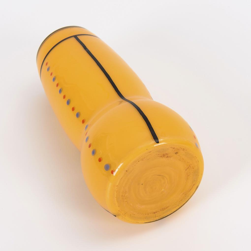 Yellow, colourless overlaid glass, line decoration painted in black solder, a stylised bellflower with vine on the obverse. H 27 cm.