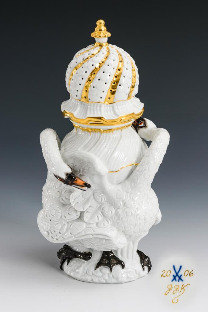Großer Zuckerstreuer in Form eines auf zwei Schwanenrücken stehenden Gefäßes.