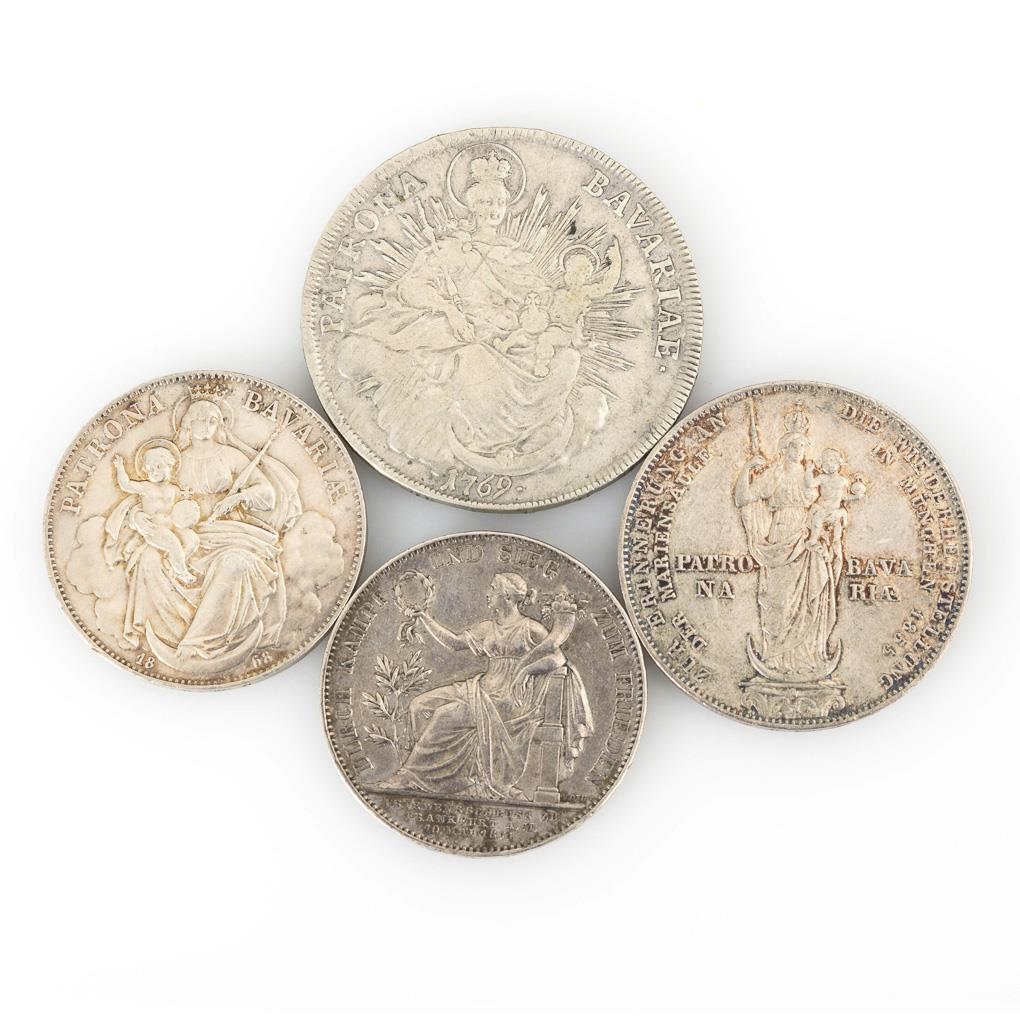 Madonnentaler 1769, "Patrona Bavariae"; "D.G. Max. Ios. U.B.S.R.I.A. & EL.L.L." / Mariengulden, "To commemorate the restoration of the Marian Column in Nuremberg in 1855, Patrona Bavariae"; "Maximilian II. Koenig v. Bayern" / Geschichtstaler or Siegestaler, "Durch Kampf und Sieg zum Frieden, Friedensschluss zu Frankfurt a.M., 10. Mai 1871"; "Ludwig II. Koenig v. Bayern" / Vereinstaler "Patrona Bavariae 1868"; "Ludwig II. Bavariae Rex". Condition: all very nice.