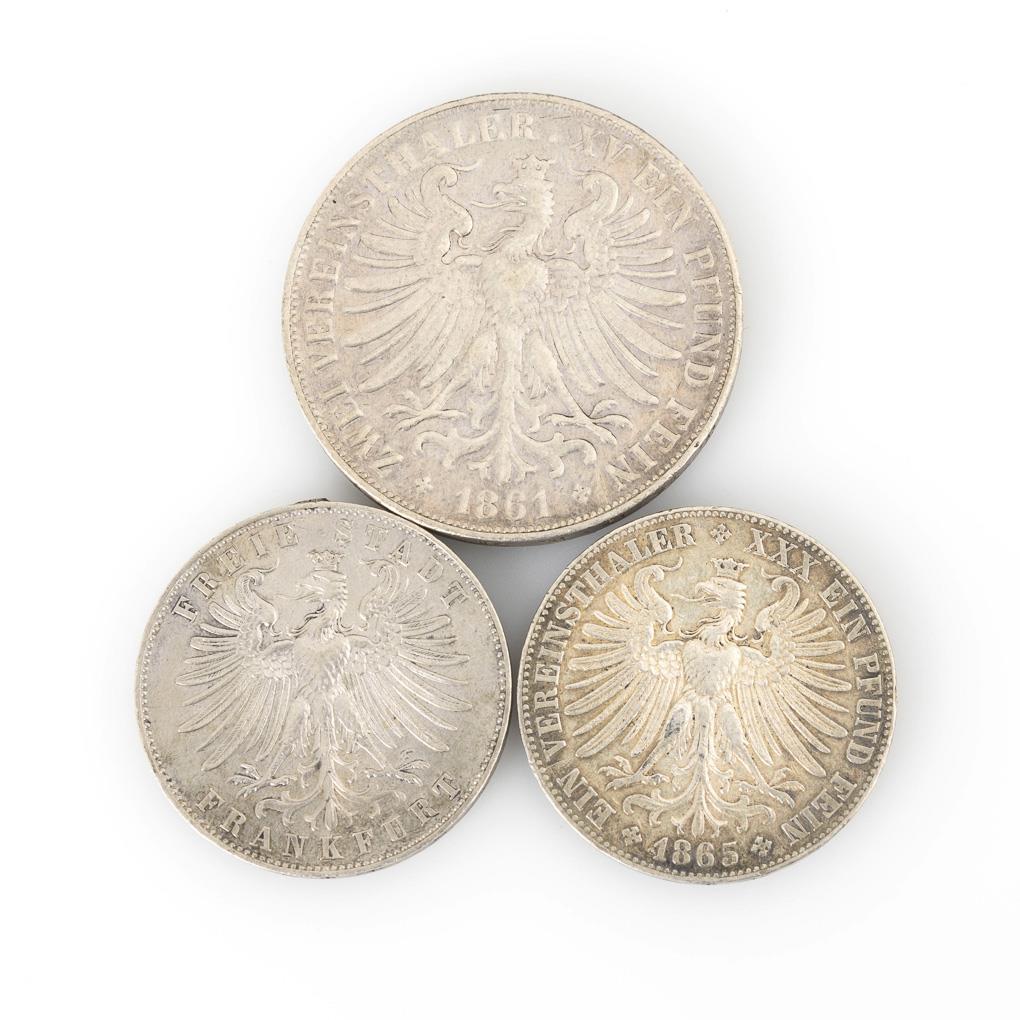 "Two Vereinsthaler, XV one pound fine, 1861"; "Freie Stadt Frankfurt" / "Ein Vereinthaler, XXX one pound fine, 1865"; "Freie Stadt Frankfurt" / "Ein Gedenkthaler zum Deutschen Schützenfeste, Juli 1862"; "Freie Stadt Frankfurt". Condition: very nice/beautiful, 1x handle mark.