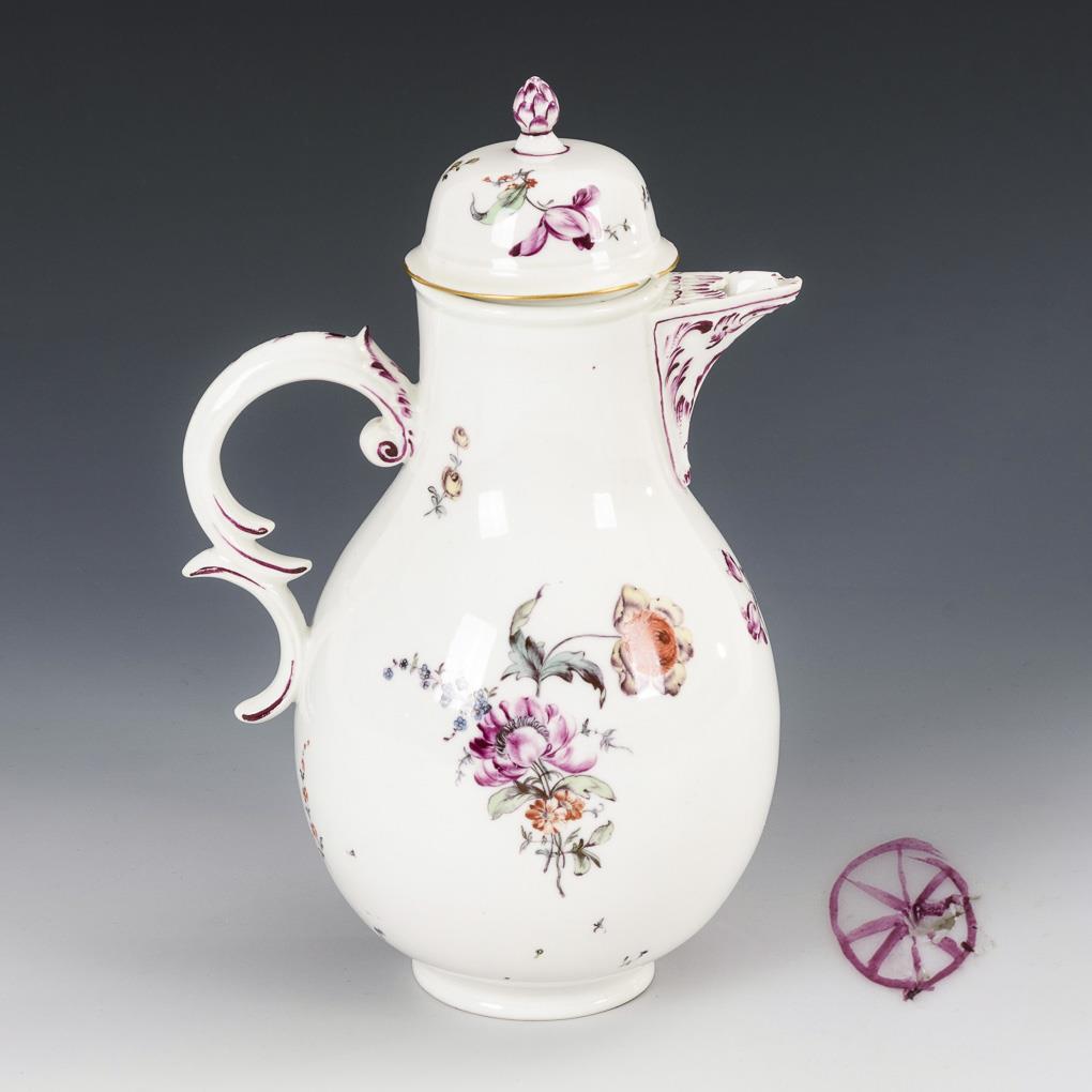 Pear jug with rocaille leaning handle and finial and supplemented bud knob lid. Bumped lid rim, finial tip bumped.