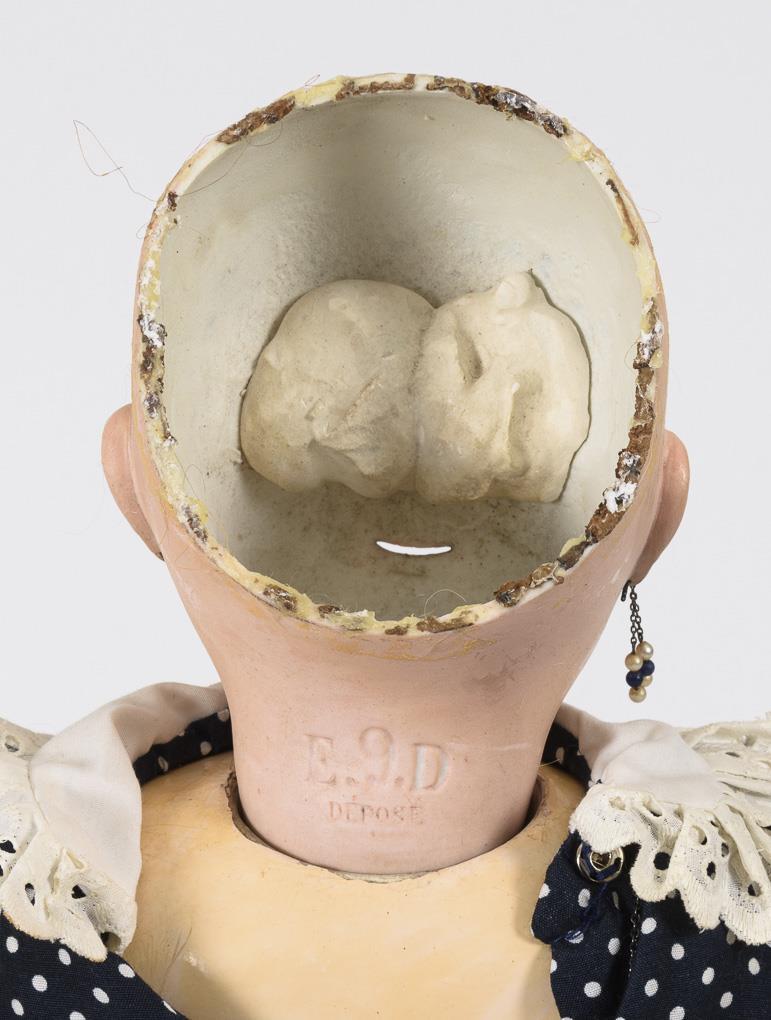 Crank head, blue paperweight eyes, row of teeth, pierced ears, brown human hair wig. 11-piece limb body with 2-piece torso, defective traction voice and unusual leg attachments. Dark blue dress with white dots, white apron, lace bonnet and white leather shoes. Head restored. Body with (paint) defects and repairs, voice missing.