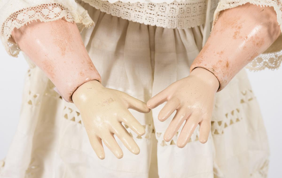 Crank head, brown sleep/shelmet eyes, medium blonde mohair wig. 15-piece limb body. White dress, bonnet, light leather boots. Head x-rayed: without defects. Waltershäuser body with defects on the torso (from the doll stand), hands painted over, defective eye frame (eyes somewhat fallen backwards).