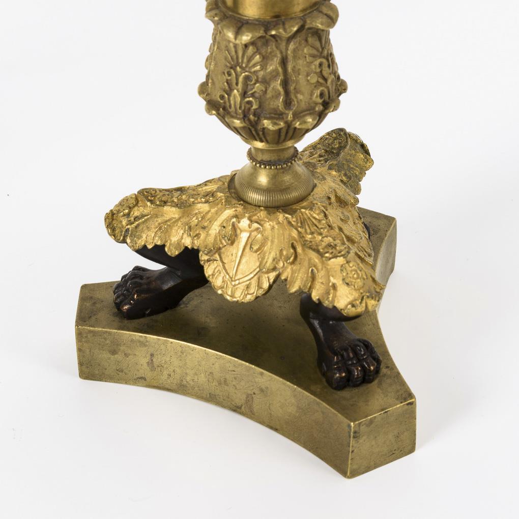 3 paw feet with foliate decoration on 3-sided plinth, column shaft with foliate decoration at the base as well as leaf-decorated vase spout. Some cracks and dents on the sheet metal column shafts, 1x skew.