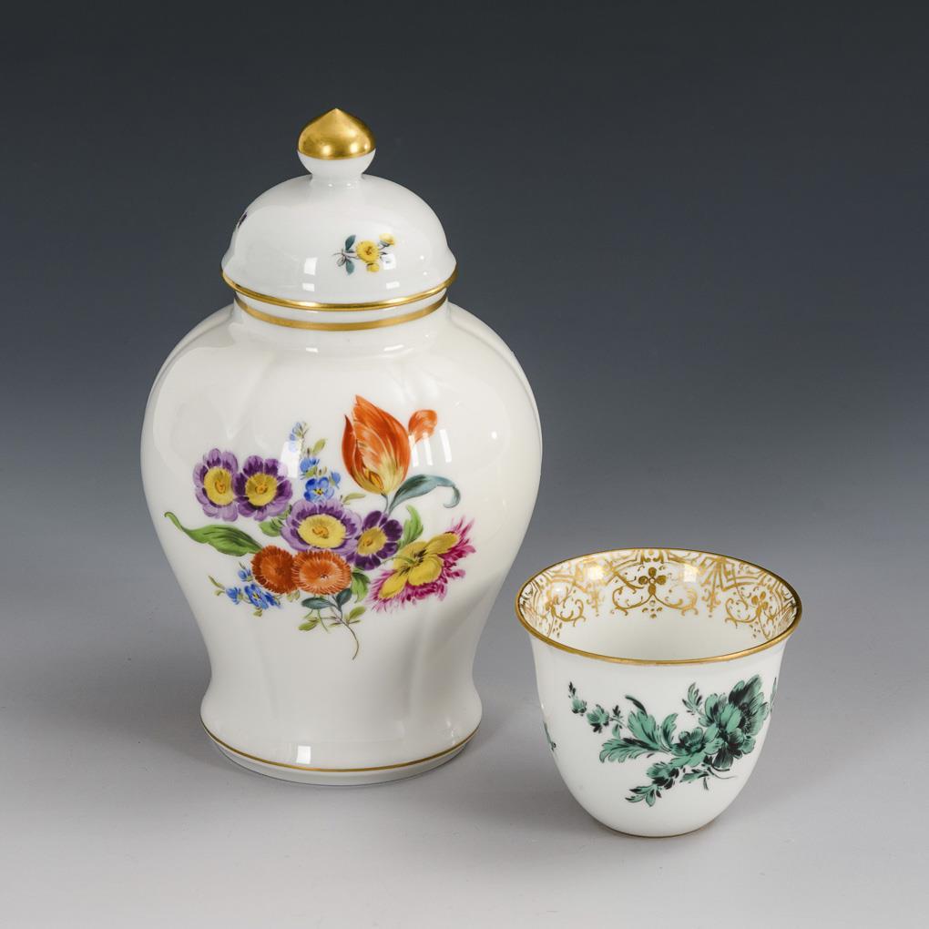 Polychrome painted, gold decorated. H vase 14 cm, H Koppchen 5 cm.