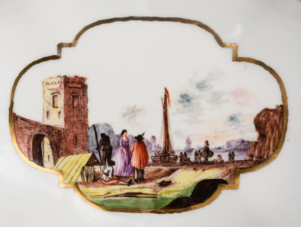 Oval-vierpassige Schale. Im Spiegel eine Vierpasskartusche mit einer Hafenszene, gelber Teilfond. 1 Wandungsrestaurierung.