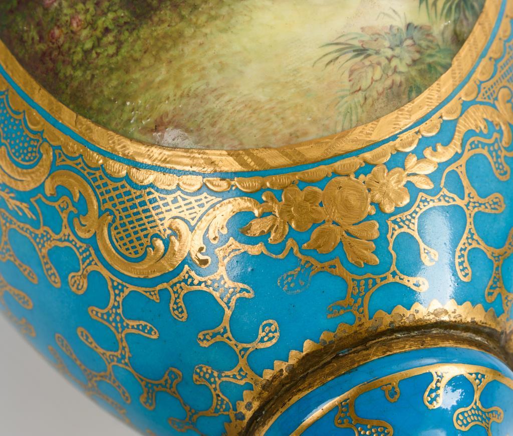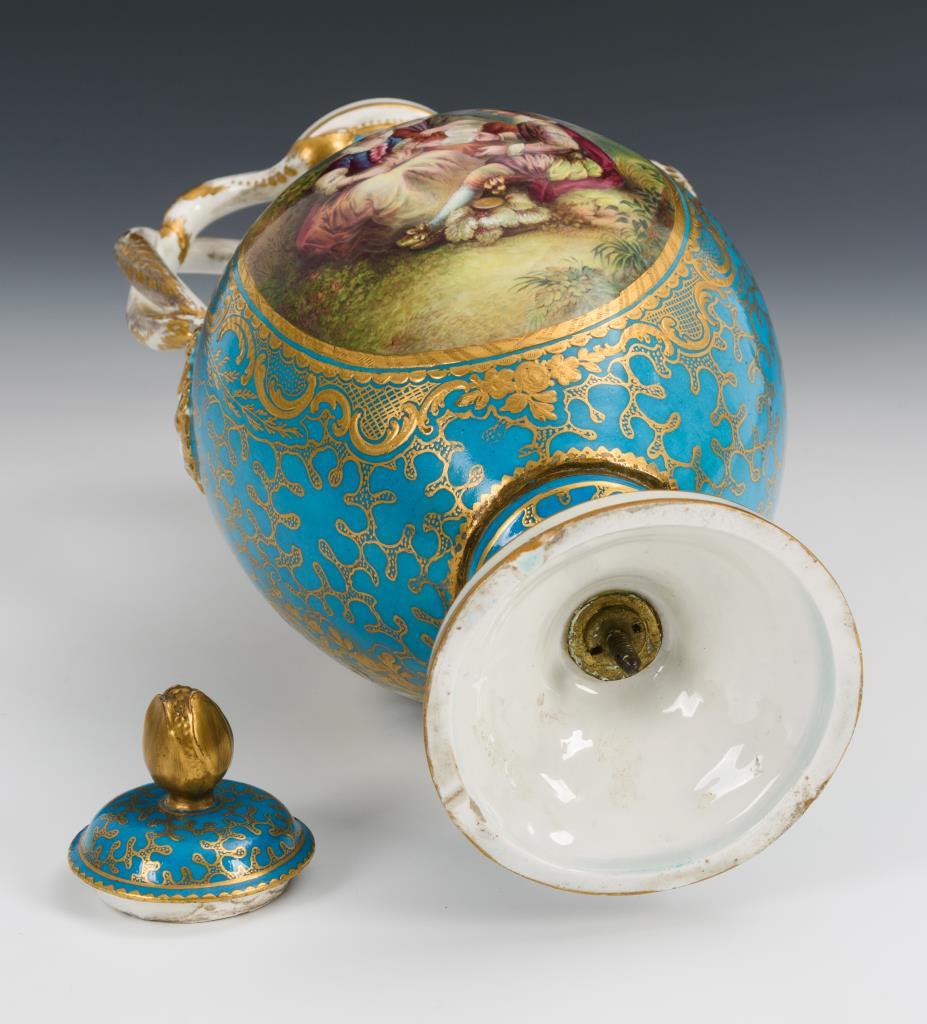 Ovoider Korpus, gedrehte Asthenkel, Knaufdeckel, Rundfuß. Türkisfarbener Fond mit reicher, ornamentaler Goldmalerei. Schauseitig ein Medaillon mit der Darstellung eines jungen, zwei Damen vorlesenden Mannes, verso ein Blumenbukett. Minimale Bestoßung am Stand, Knauf restauriert.