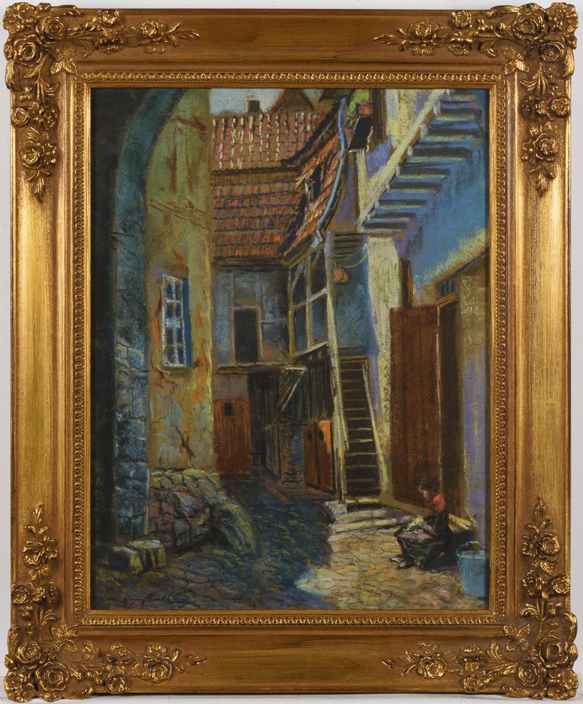 Staffage figure on a staircase at the open door in the narrow courtyard with incident sunlight.