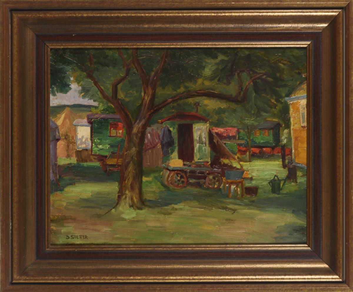 The colorful wagons between trees near the tent recognizable further back.