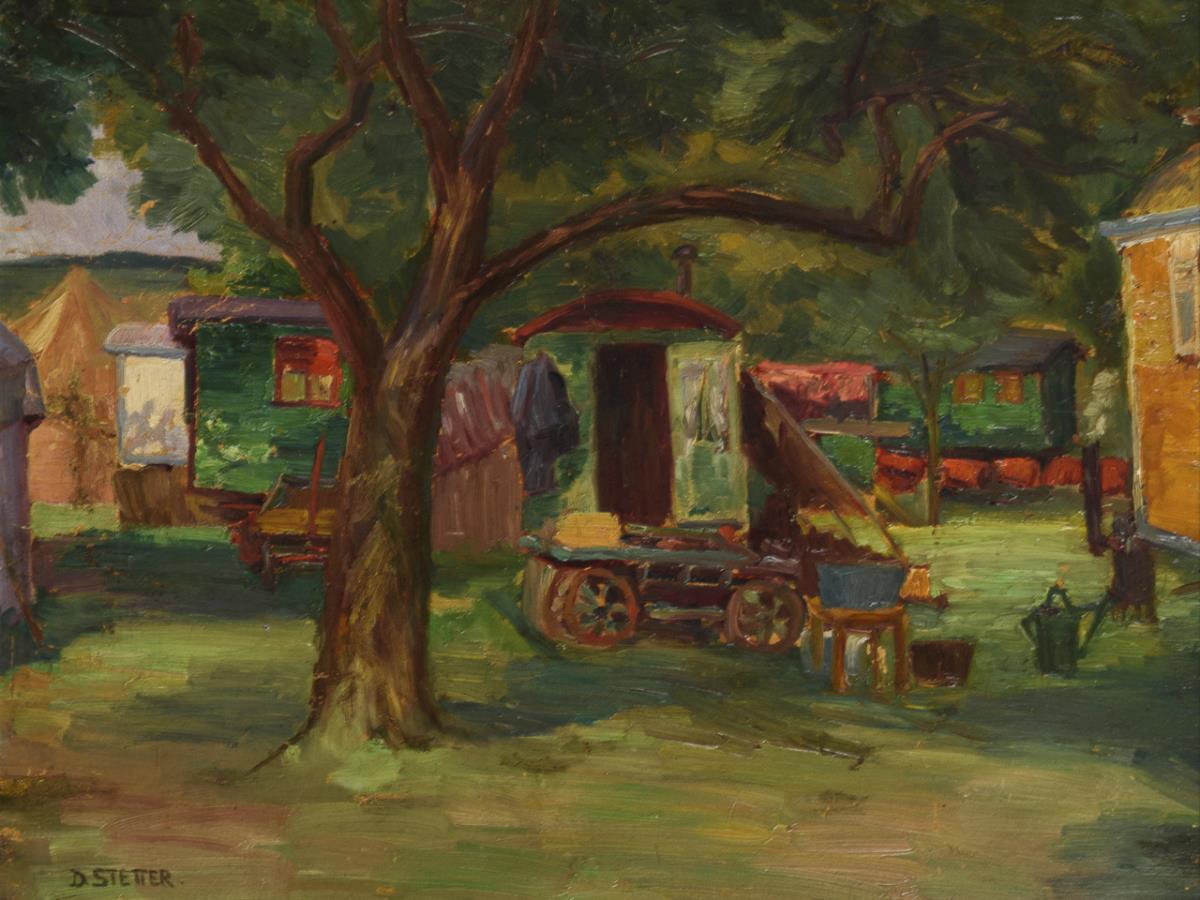 The colorful wagons between trees near the tent recognizable further back.