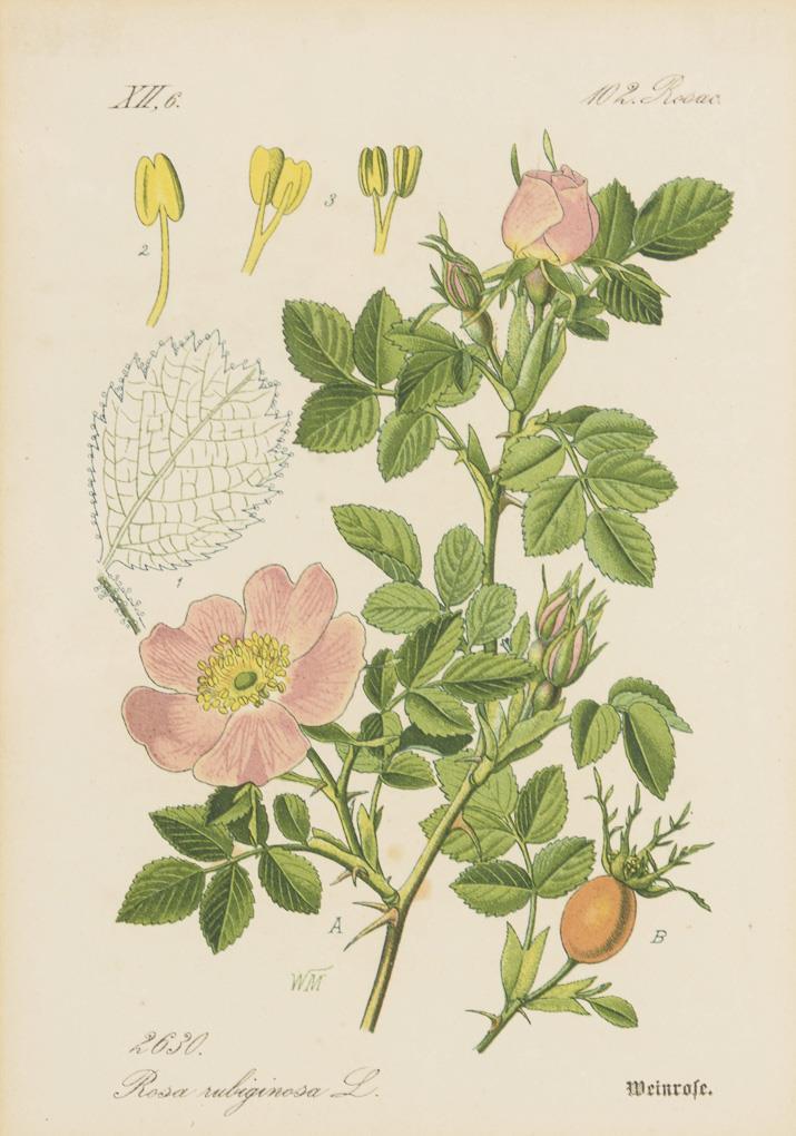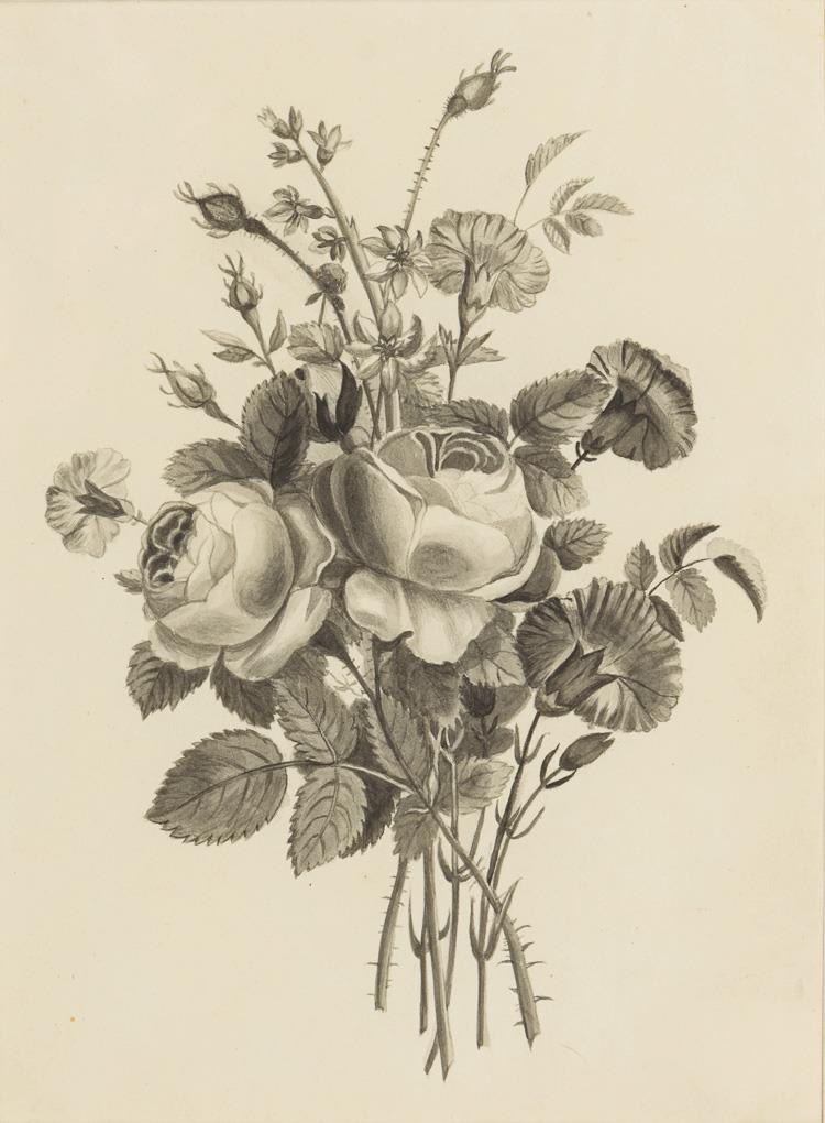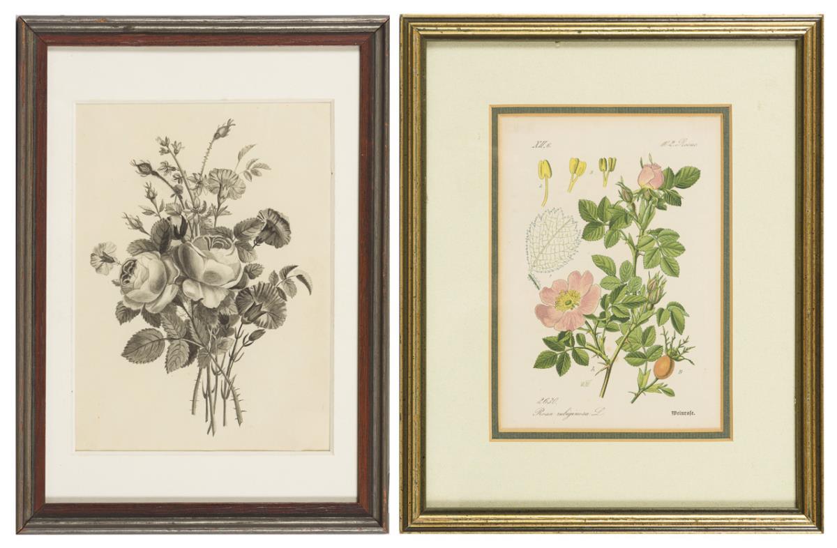 Lavender Drawing with Rose Bouquet, framed & behind glass: 33 x 24 cm | Botanical Illustration of the Vine Rose, framed & behind glass: 28 x 23 cm.