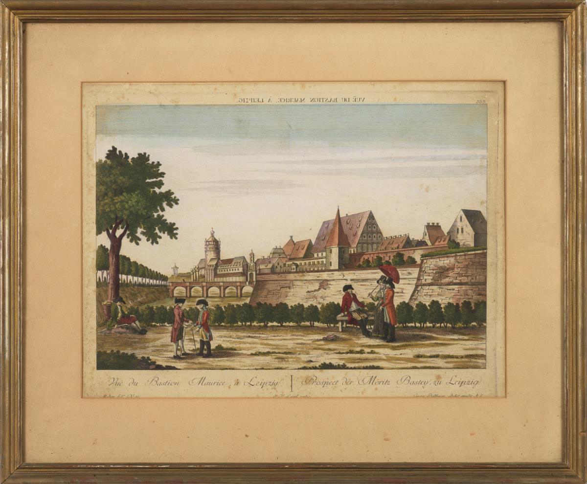 Side-inverted view of the Moritz Bastion in Leipzig and staffage figures, inscribed "Vue du Bastion Maurice à Leipzig", in French and German "Vue du Bastion Maurice, à leipzig", "Prospect der Moritz Bastey zu Leipzig", after a drawing by Balthasar Friedrich Leizelt. Heavily foxed, traces of handling.